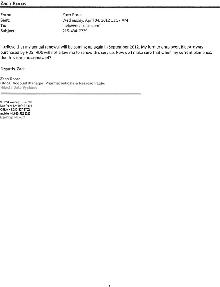 I never heard from anyone from eFAX. I was charged $169.50 on September 15, 2012 and didn't act on it quickly enough with my credit car provider. On October 2, 2012, I called eFax not thinking that there would be a problem but they refused to submit a refund stating that I did not contact them via chat or by telephone that's on their website and that I did find today by doing a Google, which in hindsight, I should have done back in April. In the meantime, it would have been nice if their helpdesk had contacted me and told me what to do, but they didn't. So no I'm out $169.50 for a service that I won't use for the next 12 months, and haven't used since January 2012. Can anyone recommend what avenues that I might have short of small claims court to recoup my money? They clain not to have received my email which smells fishy since I didn't get any notice that it wasn't delivered properly.