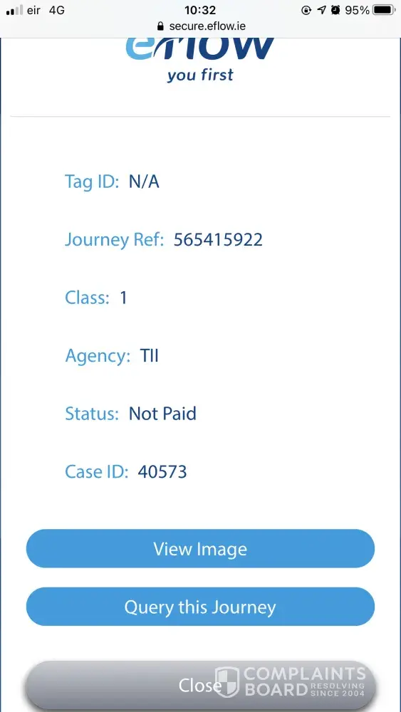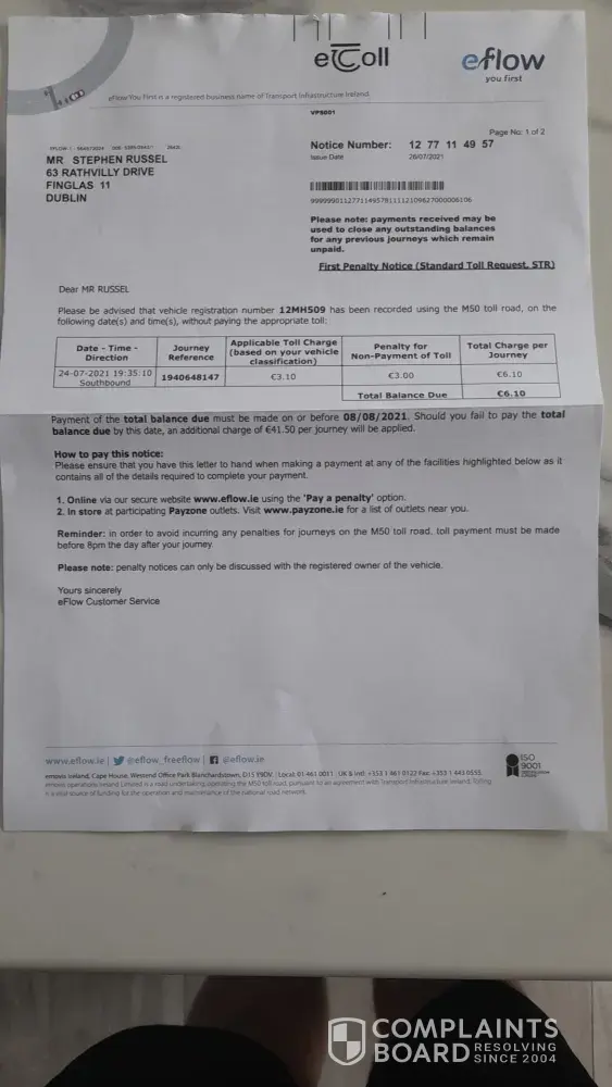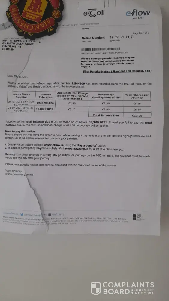 I had the worst experience I have ever had with the resolver team in eflow. I had checked my app one day to pay a toll and nearly had a heart attack when I realised there was fees of €288 outstanding. I had clicked into the fees and said multiple trips had gone unpaid. Funnily enough i had proof of payment for all bar one (which I had paid in shop but didn't keep the receipt). I called the customer service department and was put through to a Ryan. Ryan firstly became extremely aggressive towards me and basically called me a liar. I had then asked to be put through to a manager as I was shocked at being spoken to like that. When I addressed the agents manor to the "manager" he said he listened to the call and thought his tone was appropriate. Over the course of this week I had rang three or four times and each time was greeted with a rude and unhelpful agent. What's funny about this situation is I am one of the ones who pays their tolls and has never had an issue like this before so I am shocked at this businesses stance on customer service. I then researched complaints and realised all the people I had been dealing with ie Graham Ryan etc and were also aggressive towards other customers which seems to be to get a rise out of them so they don't have to offer the 50% reduction on fees. What a business model. After I read the reviews I realised I was fighting a losing battle so I gave in and paid half €144. This is extortionate and an investigation needs to be done here. I have paid all my tolls but was penalised because I didn't have the physical receipt.