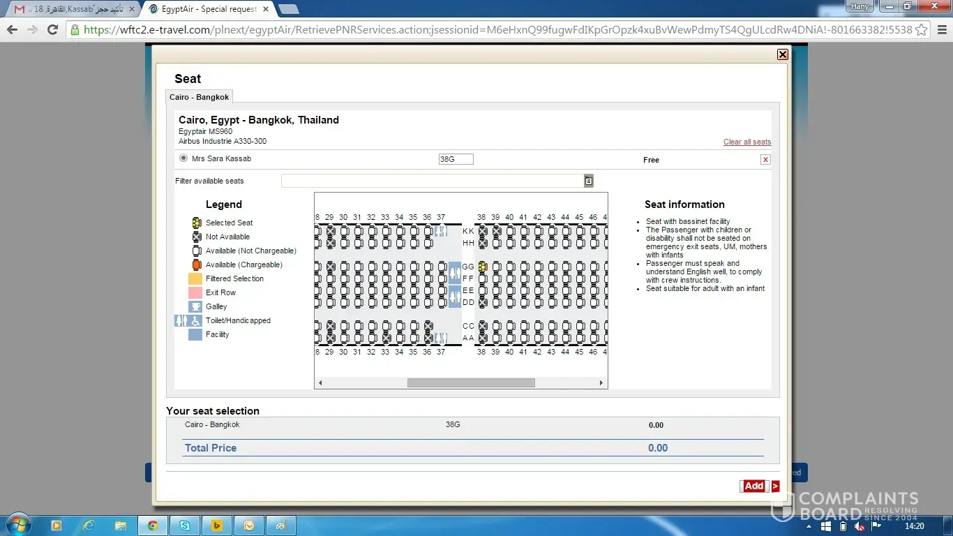 i am trying to make a seat reservation from Egypt air travel from Cairo to Bangkok as it will take more than 9 hrs, and my wife will be an adult with a baby so we need a suitable seat with bassinet.