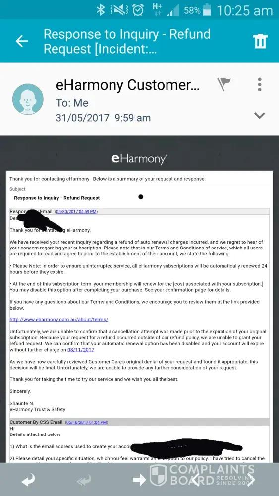 I found eHarmony’s reply infuriating, incorrect and irrelevant – why do I care about marriages in the USA when I live in England? My response to eHarmony’s reply – my request to cancel my subscription as I felt I had been misled by their advertising went unanswered until I finally took to Twitter and eHarmony replied to my tweet with a phone number to call. I called and the person was unable to help but gave me an email address I could send my complaint to. I duly registered my complaint and was informed “As mentioned in our Terms and Conditions of Service, eHarmony is unable to grant refund for any reason if a refund is not requested within the first 3 days of the initial subscription date. As a result, I am unable to grant your request for a refund.â€