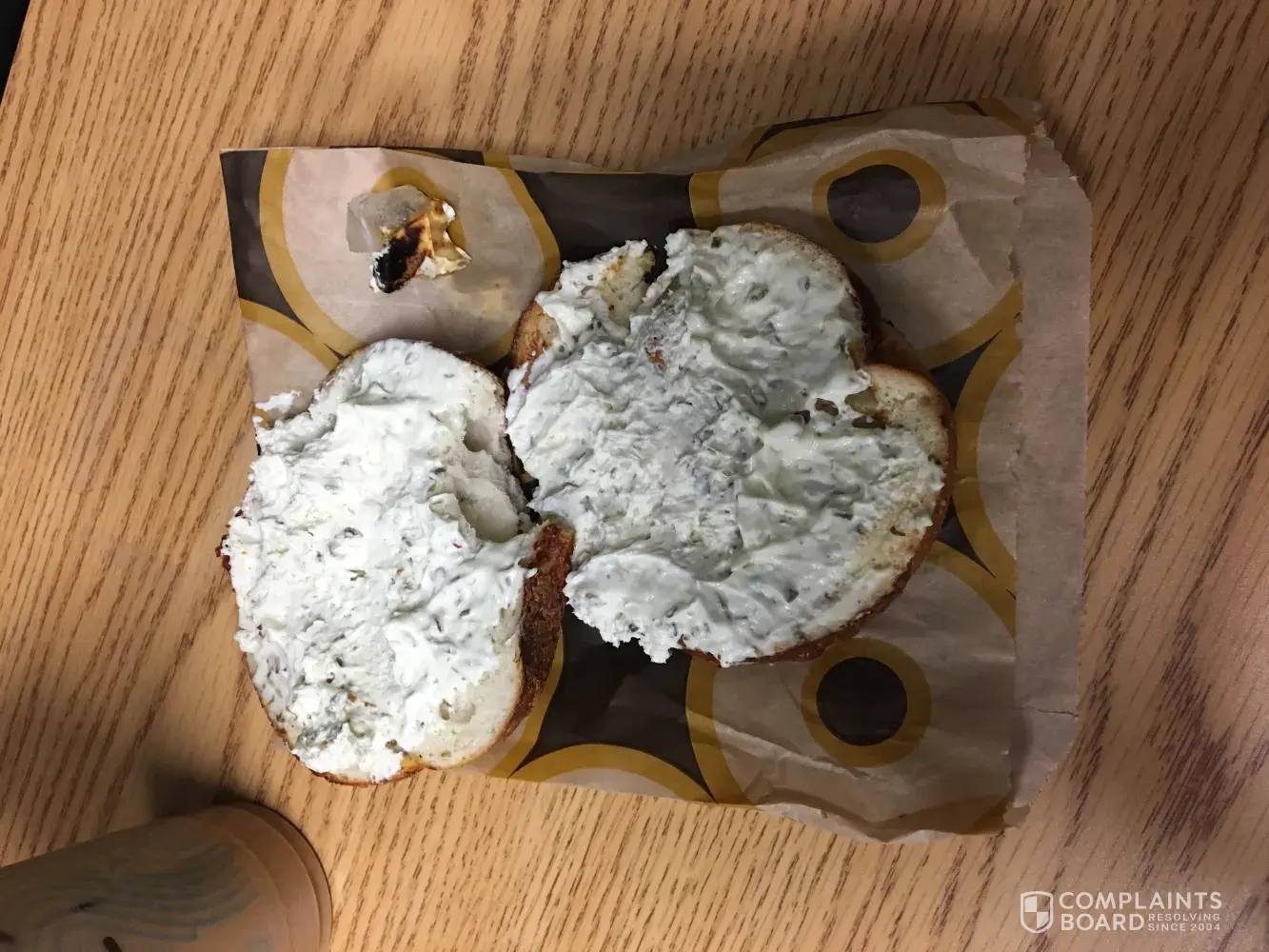 I ordered a jalepeno cheddar bagel with onion cream cheese at the Dubuque Iowa, Wacker Drive location. When I opened the bagel to eat it there was a big lump on the corner of the bagel, it was burnt and covered in cream cheese. I almost continued to eat it thinking it was a jalepeno or an imperfection in the bagel but when I looked closer it was wax paper. There was a wad of toasted wax paper that had been spread in with the cream cheese that I almost ate!