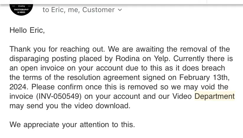 100% accurate I was threatened with law suits and coerced to sign an array of documents or otherwise they used my fully paid for wedding photos and videos as a bargaining chip. It's been well over a year since my wedding and I still haven't received a working video of the contracted one hour video. They are in breach of contract and Im pursuing the matter legally because they leave me no other choice. I REGRET hiring them.