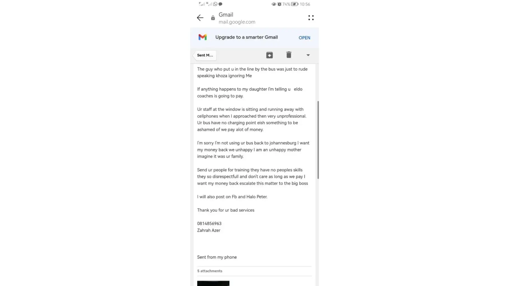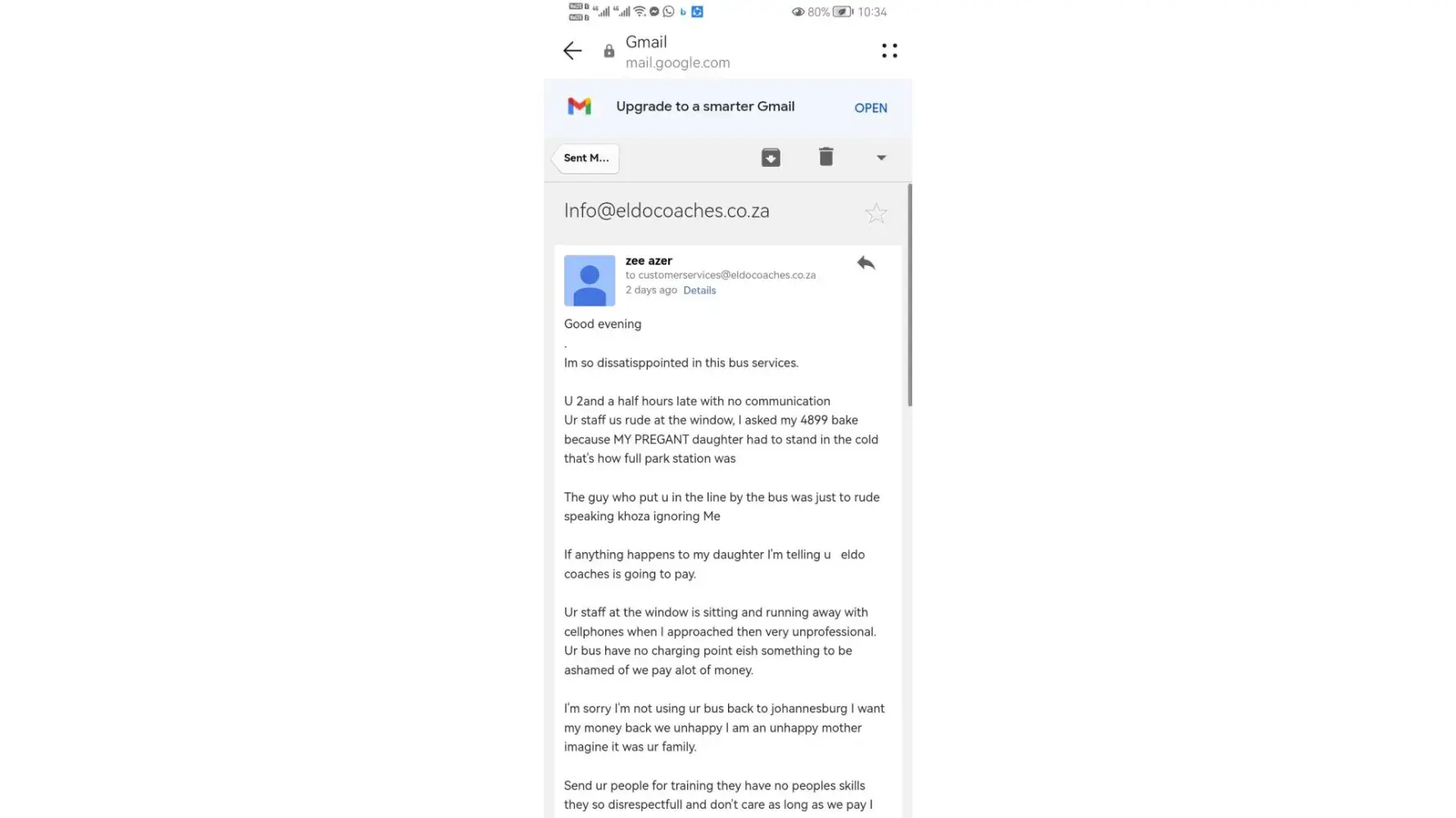 Hi, we had to wait 2and a half hours for this bus to come, my daughter is pregnant she had to stand in the cold all seats where taken inside refer to my attachments..ur staff at the window is rude ur staff directing us where to stand and wait is rude and speak in his language we didn't understand. There was no communication from ELDOS Staff, I want my money back I refuse to take this bus back Sunday the 14th I'm going to the police as everybody on ur platform and whatsapp lines is ignoring me 4660 I want it back. No charging point change ur adds on the site of u lie man. I'm an upset customer which had 3 kids with me. AL is want is my money. Read my emails below I have send to ur head office. [protected] Zahrah