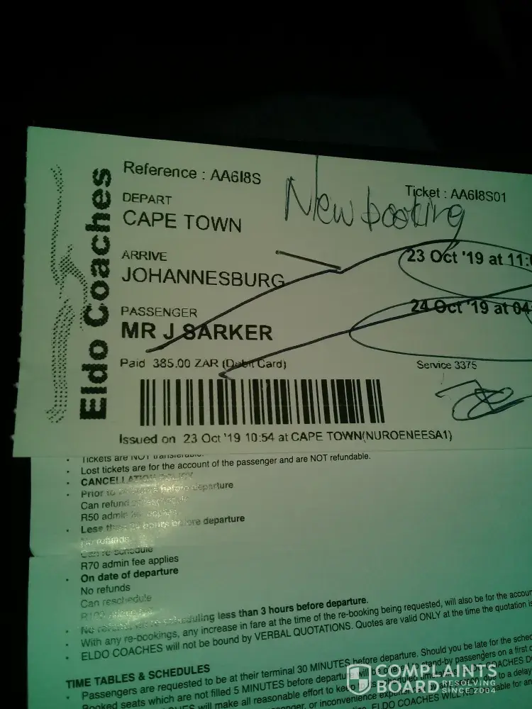 On the 25th October 2019 I booked 5 tickets with Eldo coaches. One from Kakamas to Jhb for the 12th December 2019 and 4 from Jhb to Kakamas for the 15th December 2019.