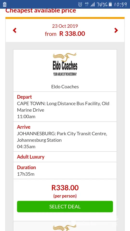 Hi I checked the price for a bus ticket. Which is from capetown to Johannesburg, departure time 23:00. ( 23/10/2019)Arrival time 5:30 (24/10/2019).