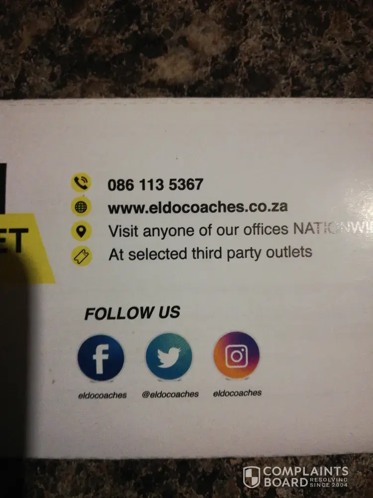 We booked eldo coaches bus from Johannesburg to Durban and we were suppose to depart at 10 around past 11 they brought a stabus instead of eldo coaches without explaining to us i am really disappointed about the service we received from eldo coaches never again will i book it