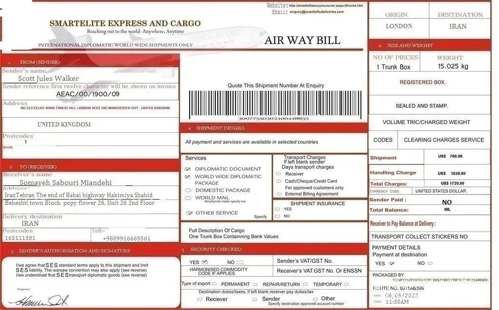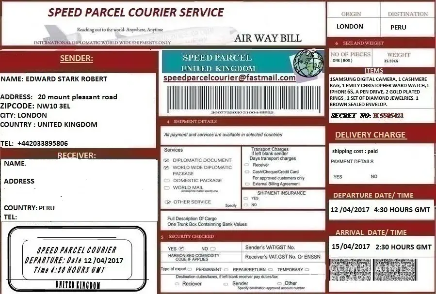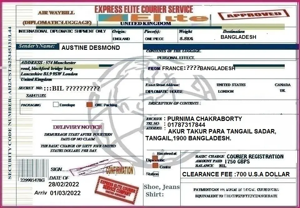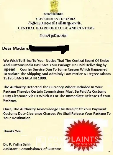 Some time later, when he had the confidence of my mother, he told her he would send a package with gifts by the company ELITE COURIER EXPRESS. My mom printed receipt of the gift, but the next day received the following mail, by a representative of India: