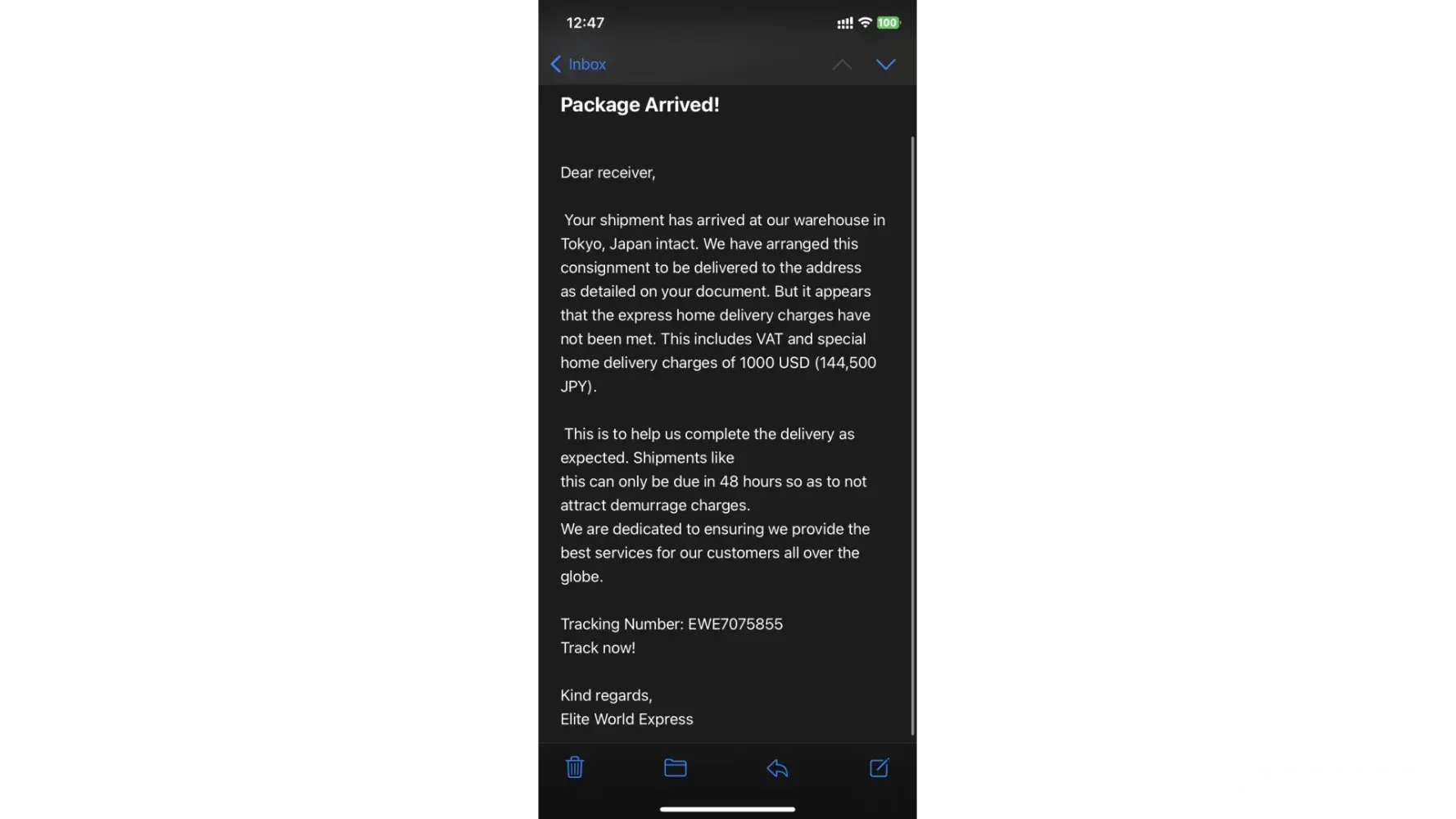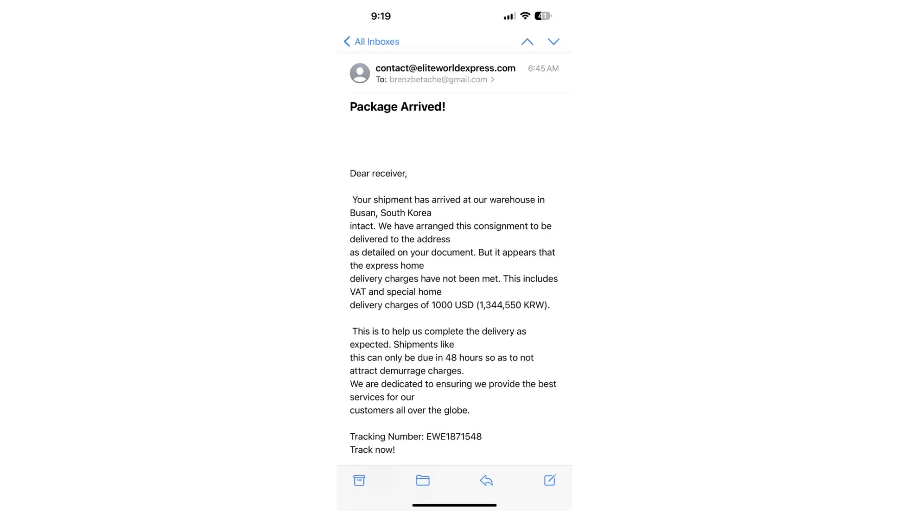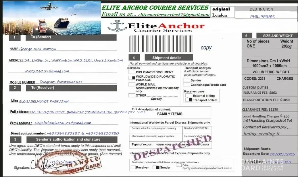 Hello Miss... I am Mr Micheal from ELITE Courier Service. Madam i am writing you in regards to the parcel sent from Peter kwan from Warsaw Poland and your parcel is currently on transit at Damascus international Syria and your parcel will be delivered to your home address at (Damascus Syria suburb of Qdsia island C3 block 3/4 land house) in the Evening time but you are to pay for custom clearance and delivery charge of $600 to enable us Clear your parcel and deliver to you today. Thanks for choosing ELITE Courier Delivery Service. Your services our utmost Concern. Sighed by the Management ELITE Courier Delivery Service..