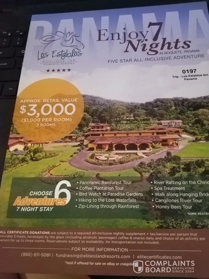 What am I missing? I read the complaints above and not one of them mentions that their not-for-profit organization benefited from the auctioning of the Elite Isand package.