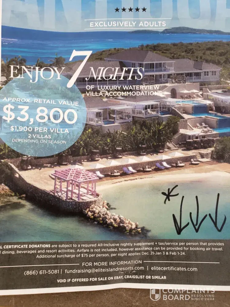 I contacted Elite Island Resort directly. I spoke to and emailed the President, Steve Heydt([protected]@eliteislandresorts.com). He was smug, pompous and actually giggled while I expressed my concern and disgust for the advertising. He noted the disclaimer. I was and am aware. He also noted I could use the certificate at another time when the rates may be higher? Really? When might that be? For a 6 period time---there is NO cheaper advantage or winning.