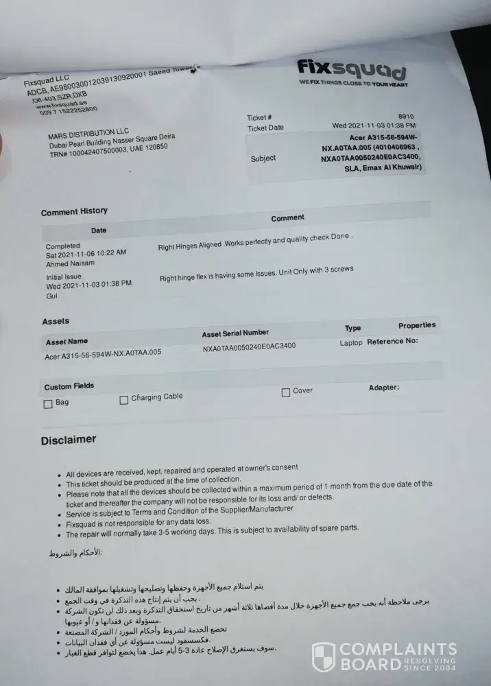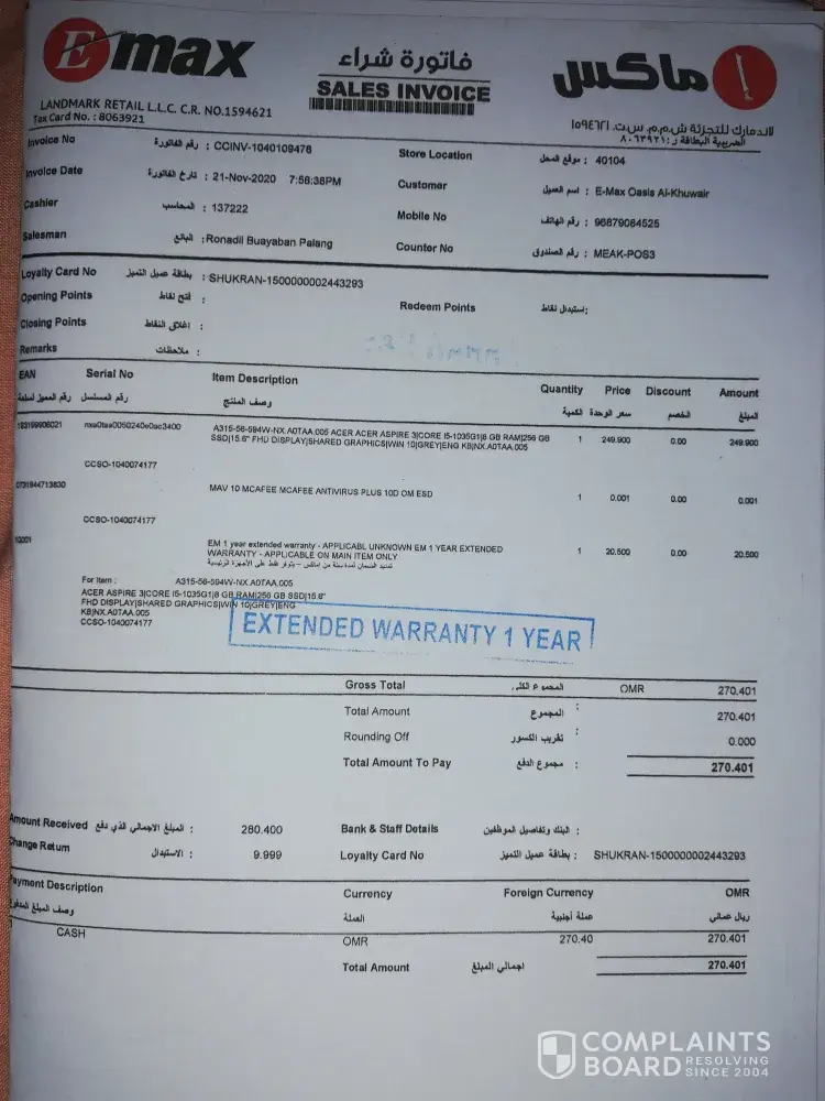 Customer service is reluctant at repairing my acer laptop purchased from Oasis Mall AlKhuwir branch