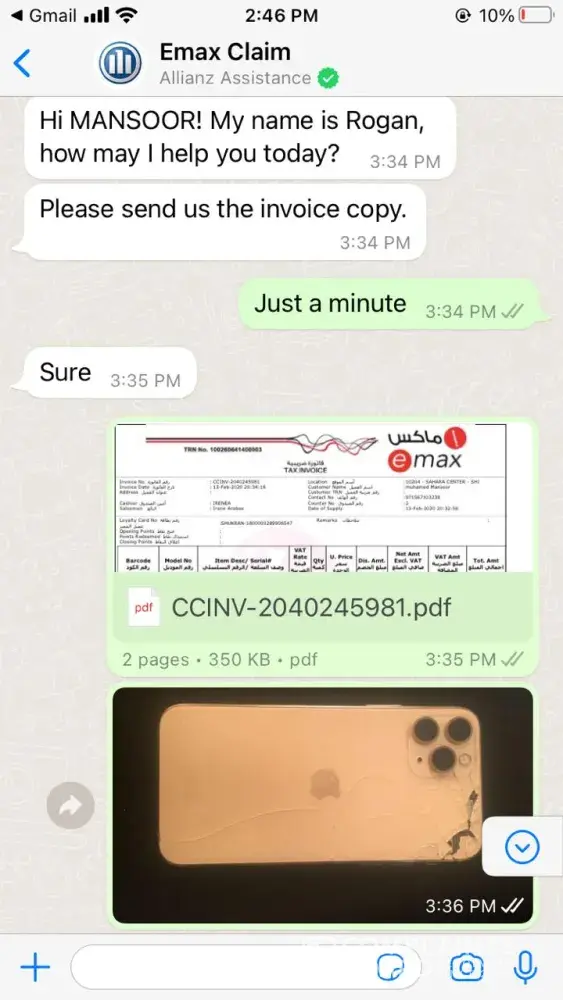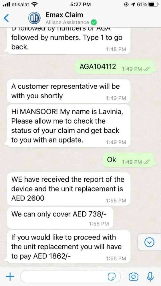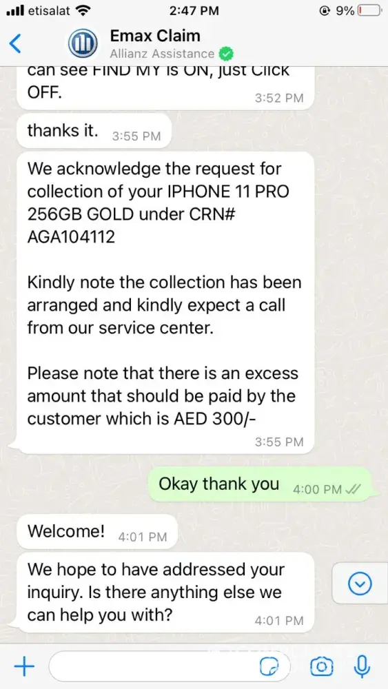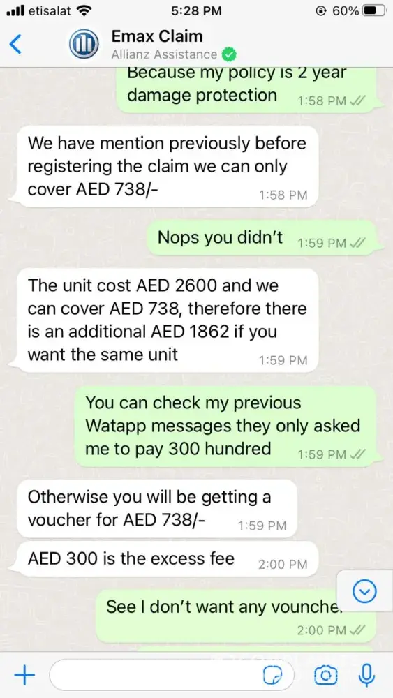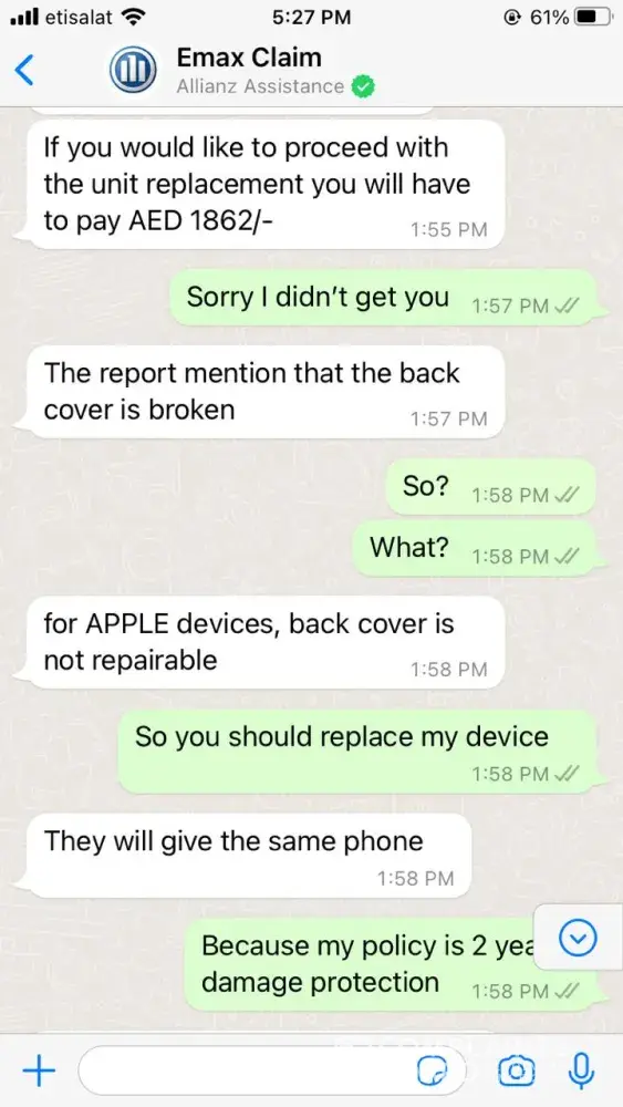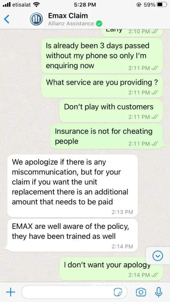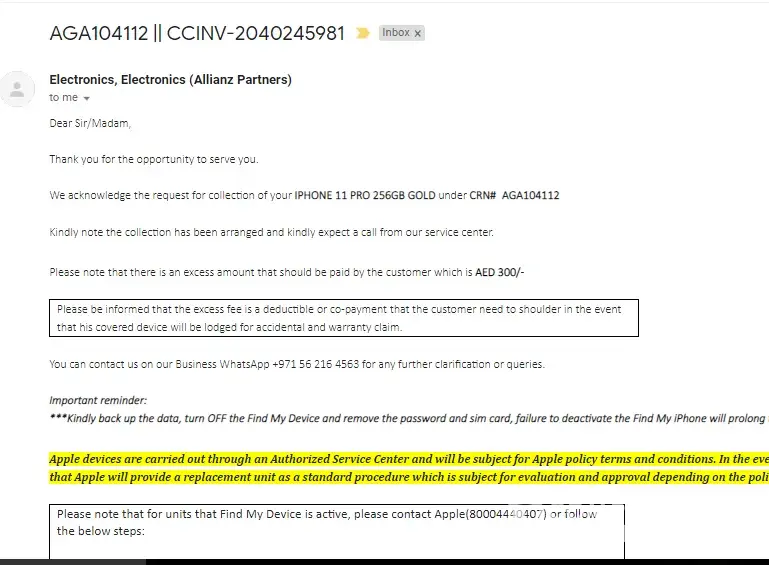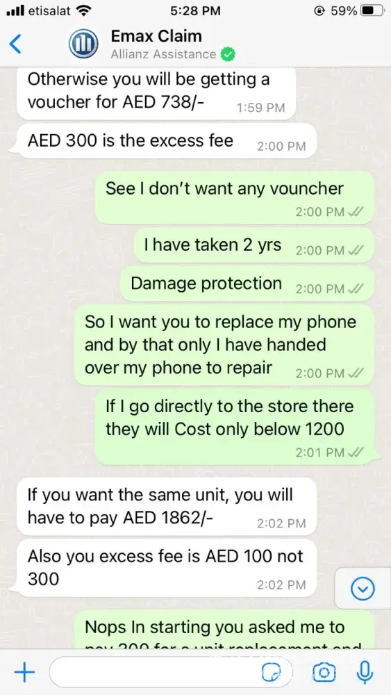 I have taken 2yrs accidental damage protection policy for my iphone 11 pro and I have 2 claims throughout the policy period. When I gone for my 2nd claim as per their given information (mr rogan) I was asked only to pay aed 300 service charge and agreeing to that they have arranged for the phone collection and collected it on 25 dec 2021 and after 4 days there was no information regarding my phone so I messaged them and enquired about my phone then now they are saying (mr kelvin and lavinia) they will deduct 2600 which now they are saying for my first claim from the second claim and my policy limit is 786 (which has no where mentioned in my policy also not mentioned or given any bill after my first claim and repair) remaining amount I have to pay which was completely unethical from your side and each and every time they are sending different emails claiming different payments and not even giving better clarity regarding the issue if I am sending mail to rogan kelvin is replying from other mail and that too completely different things and other reply is coming from lavinia etc al happening in same day and saying that was technical error that's y they given misinformation is that my problem? I have all the documents with me which I will attach here for your reference. As per their given details only I have send my phone for repair and they wasted my 4 days and now when I asked they are saying all these are purely cheating from your side. So I want this issue to be sorted out soon as I don't have time to waste and I can't wait anymore please give back my phone after repair or replacement for aed 300 only