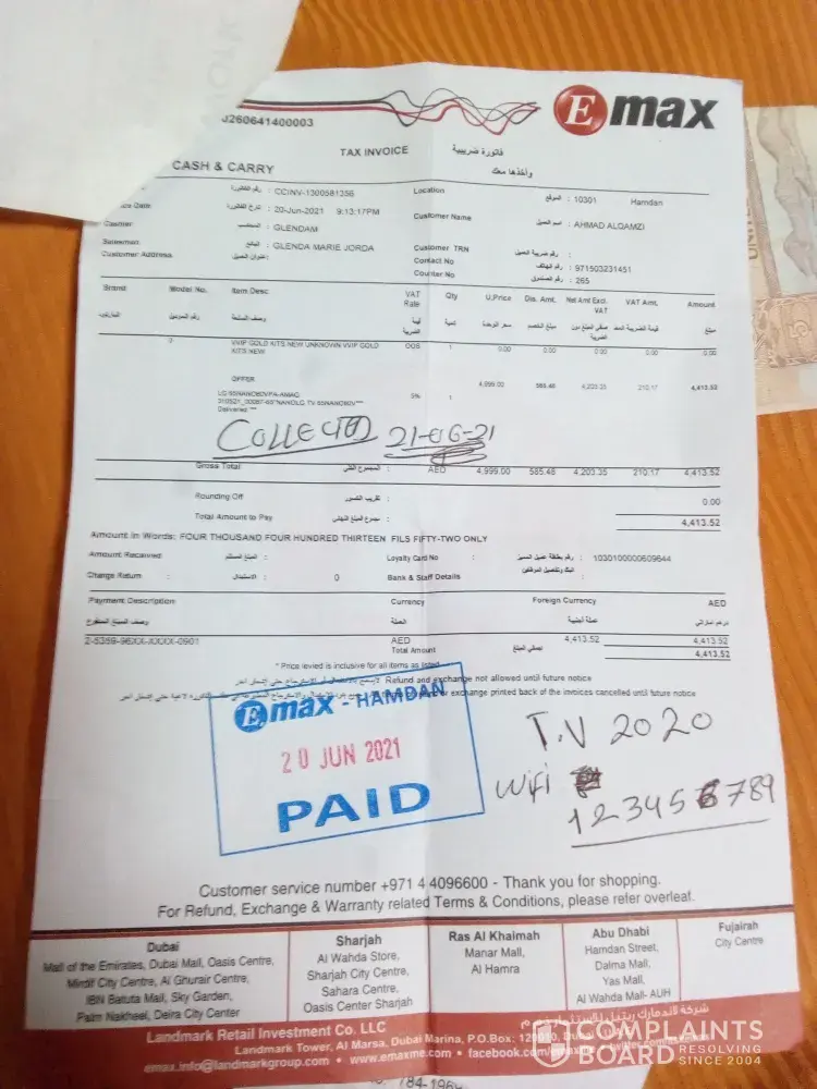 Purchased Sony TV KD55X80J 55 inches from Emax Mirdif on 14th Aug and requested for a delivery on 17th Aug. But they didn't keep their word and without any update delivered on 18th Aug evening. Hardly it worked for 1 hour and then no visual only sound comes. Next day called Emax customer care at as they only work BTW 10 to 7 and raised my concern/complaint. Person over the phone promise to send technician immediately as its new TV, which made us feel good for the kind of service. But being money spend on TV we decided to go to Emax store and discuss and to our surprise they clearly ignored to take responsibility and said TV is delivered by Jumbo and they are dealer we cannot do anything follow up with them. (Did I pay to Jumbo or emax to get this kind of service)