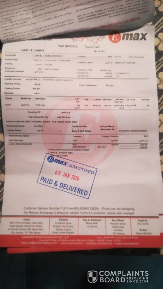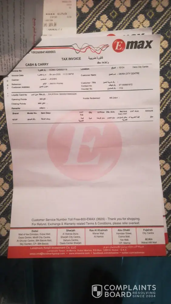 On 09th OCT 2020, I made a payment of 4899/- aed towards the subjected laptop which I collected from Mall of the Emirates branch because Deira City Centre branch doesn't have the product. Mr Sanu Magar was very helpful from start to end with the purchase. I hardly used the laptop because since the day I purchased it was working at all. Initially it used to stuck while using, secondly the same happens but with huge noise and finally it was not able to turn on at all. I left uae and went to calicut, India. When I contacted DELL customer care, they informed they will not assist even though i had international warranty on the laptop ie BQW8HX2. I had to fly back to Dubai, UAE in order to have the issue resolved by bearing flight ticket and visa expenses. On 13th NOV 2020 I returned the laptop to Mr Omar at Deira City Centre EMAX. He told will get back to me, which didn't happen. On 18th NOV 2020 I visited the same place and met Mr Sanu who assured me will draft a detailed mail to the concerned department and help me to get a credit note because the laptop is dead on arrival (DOA). He also promised to call or have the IT team call on the same day before 1300 PM which did not happen. On 19th NOV 2020 Omar called and informed they are working on it and will get back to me on Sunday ie today which didn't happen. I called him at 1518PM and he assured that will call back before 1800PM which also didn't happen. I sent him an sms requesting the status and he called back at 2133PM. He informed me the technicians from DELL confirmed that there is an issue with the HDD which they will replace and get to me within two working days. I told him clearly stating 4899/- aed is a huge amount for me. I had to work really hard, earn, save then purchase this laptop. At no cost I am willing to get a repaired or refurbished laptop. As promised by Mr Sanu I need a credit note or a brand-new DELL LAPTOP - 7590-VOS-E1393-GRY with a new unique serial number. Mr Omar said will WhatsApp me an email address to register a complaint which he did not do as of now ie 2326PM even though I sent him a reminder sms to do so.