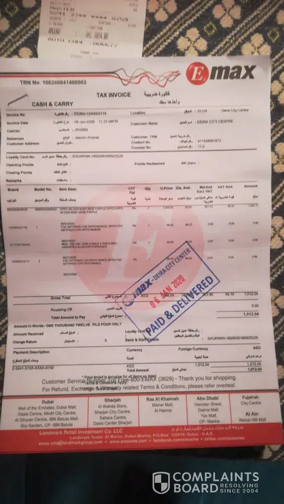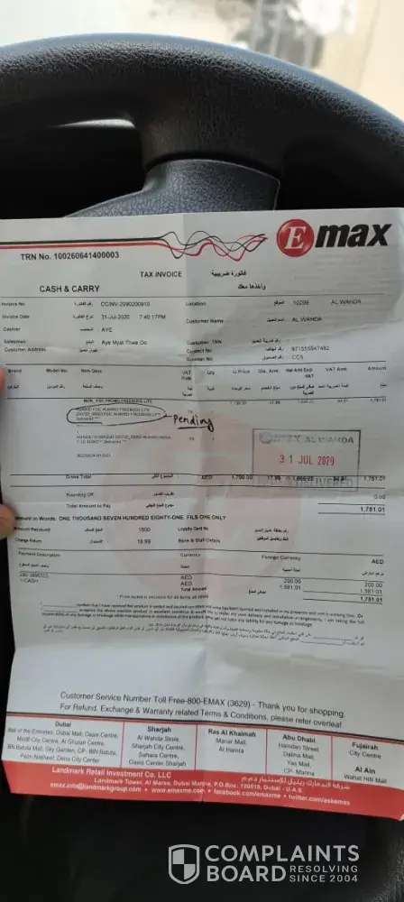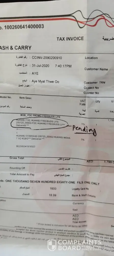 I purchase mobile and they mentioned they will provide freely airbuds but they had out of stock. 31/7/2020 on I purchased huawie nova 7 5g from al wahda e-max showroom and they mentioned free huawie foc freebuds lite in invoice. But still I did not received freebuds. From the showroom they told me to come after 2 days, I visited after 2 days, but still they dont have. Again they told me to come after days and again the same. Many times I visited e-max showroom but no proper response.