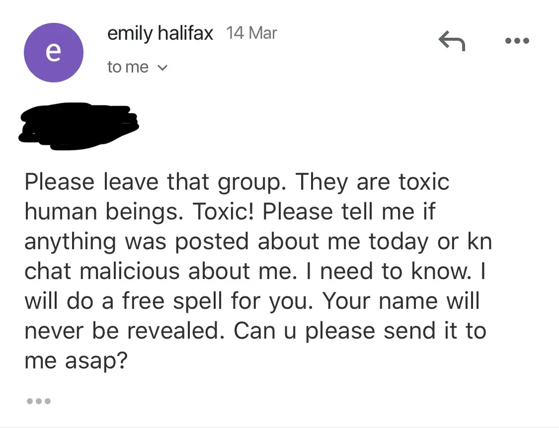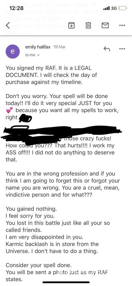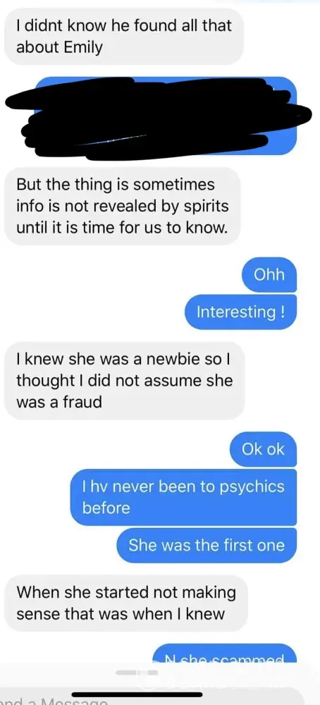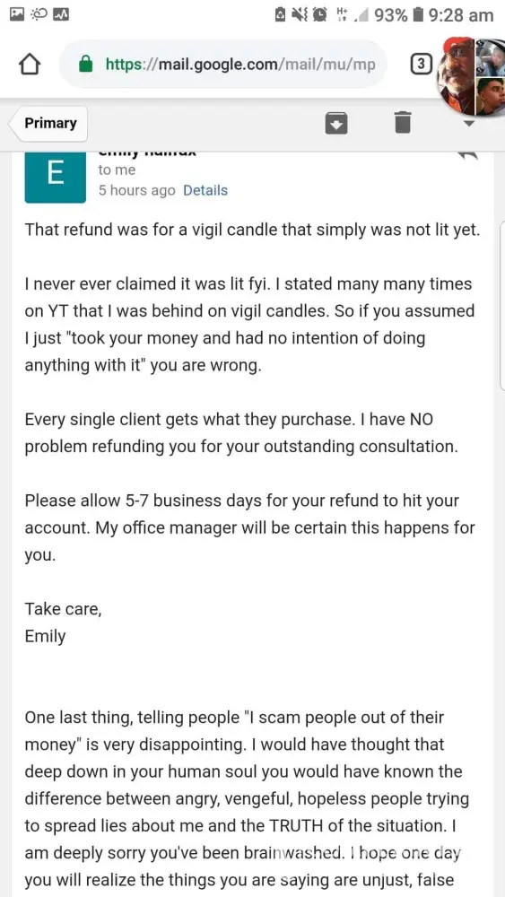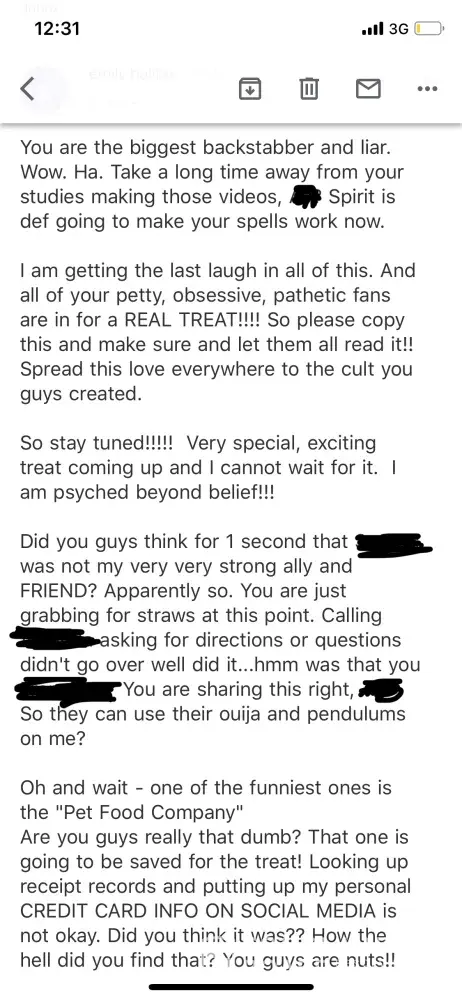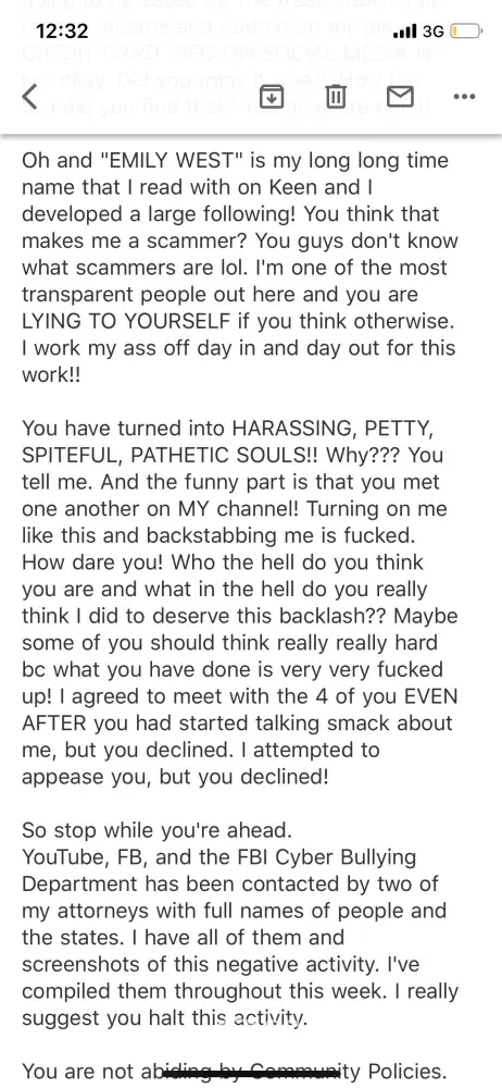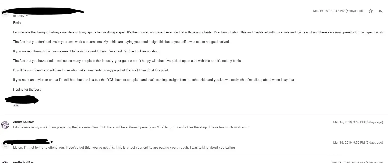 For anyone who is interested. Im a client of Emilys. I was around in chat when this group of people started down this path trying to ruin Emily and her reputation. They had a facebook group for Emily and all supported her and loved her. They all got readings and spell work done by Emiky and seemed super pleased with the resultd. Then boom out of no where these group of people decided to go across states to her hometown hoping to meet her and hangout. They were not invited, and when Emily didnt roll out the carpet to meet them, this is when feelings got hurt and they started trumping up lies against her.