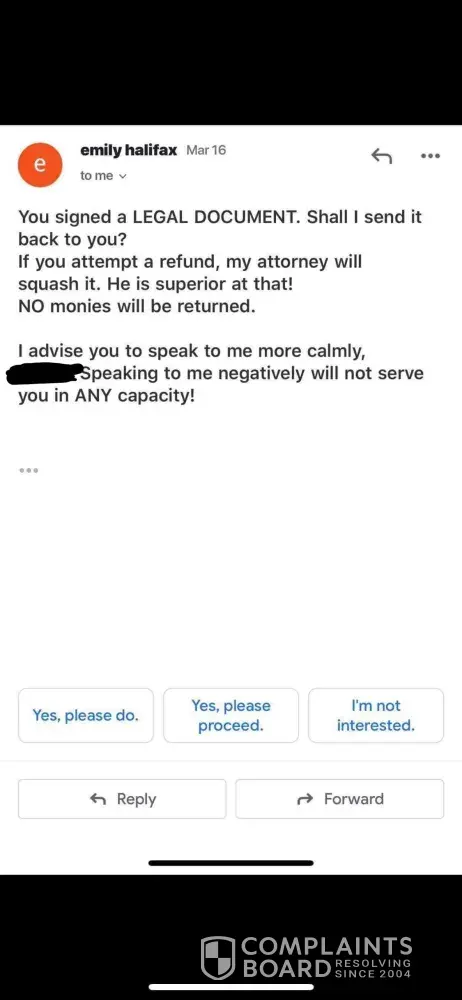"You signed a LEGAL DOCUMENT. Shall I send it back to you? If you attempt a refund, my attorney will squash it. He is superior at that! No monies will be returned.