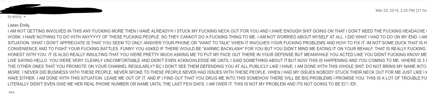 Do you seriously have nothing better to do than copy and paste this report all over the internet? I guess not. If you were indeed scammed, you would have already taken legal action, but you are just on here posting this garbage. Emily has been nothing short of amazing and helpful to me. I would recommend her to anyone. Just move on with your life. You do realize that what you are doing is harassment and needs to stop. Emily is the most transparent person I have ever seen in her line of work. Just go away and stay away.