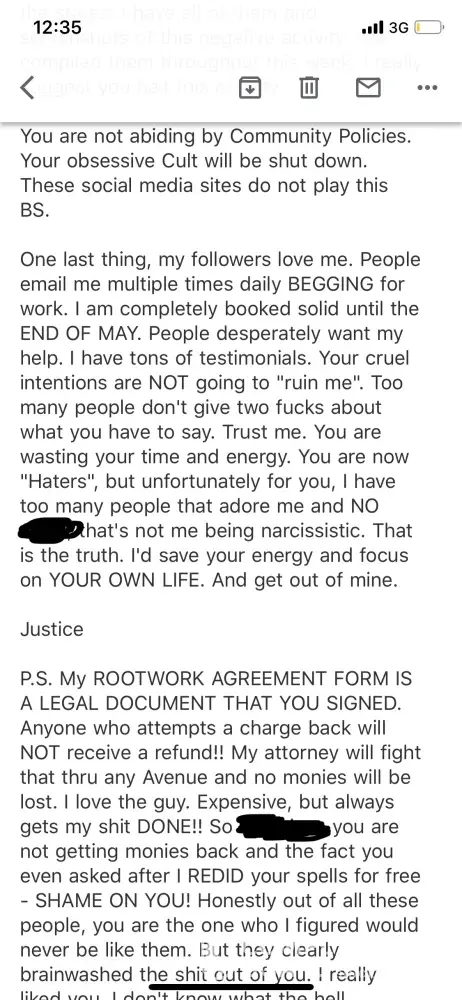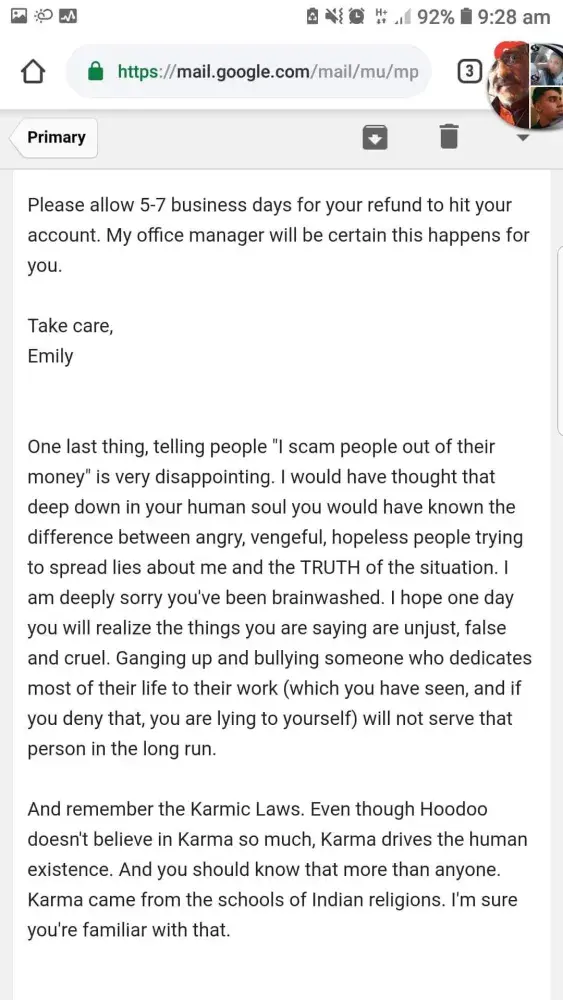 I had a consultation a few weeks back with Emily, i felt so relief after talking to her. Emily and her team are professional. I have faith in her and her Rootwork. I cannot understand where all this hate is comming from. Is it jealousness? Stop talking negative about Emily and get a life. Remember Karma is a [censored].