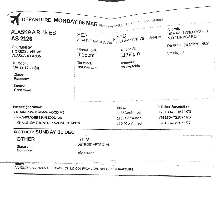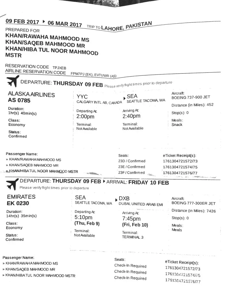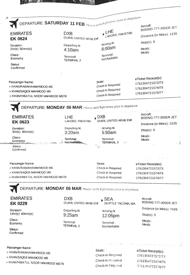 4. Now they are flying back tomorrow (March 6th, 2017) on flight EK0623 @ 03:20 am from Lahore, Pakistan, to Dubai, UAE to take their connecting flight @ 09:25 am from Dubai, UAE to Seattle, USA. We have been trying to reconfirm their supervised journey but unfortunately we are unable to do so because both Emirates and Alaskan Airlines are trying to blame each other and refusing to take the responsibility of our children.