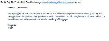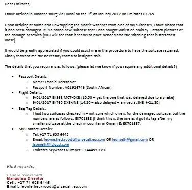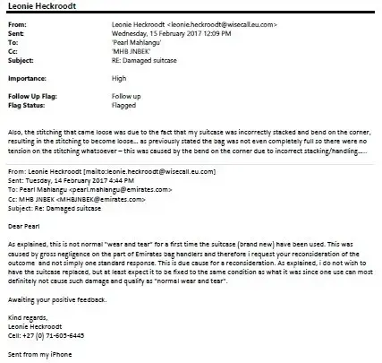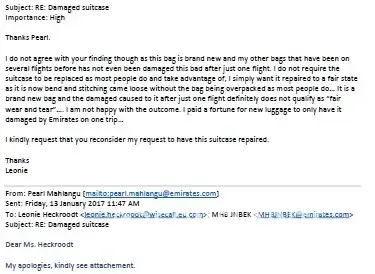 I have had email communications with emirates, and I am not satisfied by the outcome. I have requested a follow up, but to date my emails are being bluntly ignored. I have therefore decided to log my complaint here for reconsideration. Please see photo's attached detailing the communication to date as well as photos of the damage caused to my luggage (new).