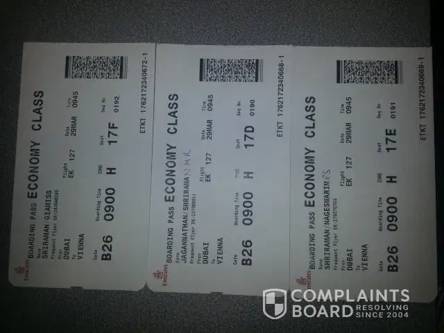 We had reached the dubai airport at 7 am to catch the flight to vienna departing at 09;45am. The airport was packed with lot of people travelling. I made my wife stand in the long q for check in I went to try the self checkin but my skywards miles card got stuck in the machine. So I ended up joing back the line for check in in manned counters. Which had less staff considering the crowd to be managed. Finally we reached the counter and the person gave us the boarding card with ticket no etkt [protected]/669-1/672-1. But he refused to accept our baggage and directed us to the supervisor.