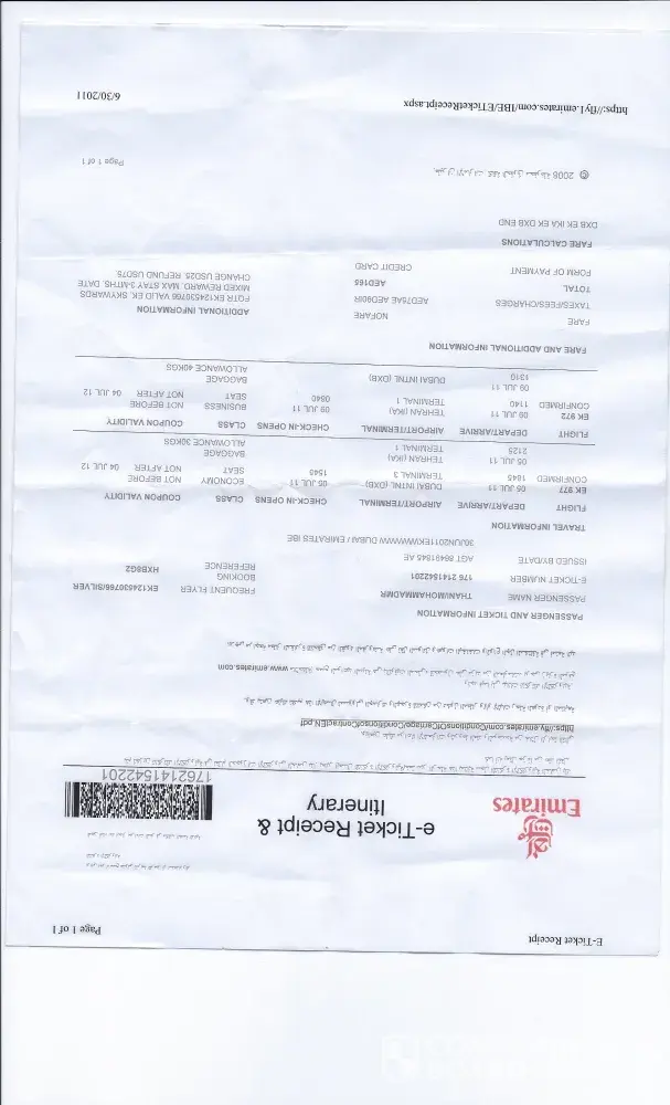 Hi I am mohammad shehab ahmad thani I traveled to iran by emirates ailine on 05 july 2011 in terminal3