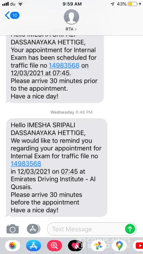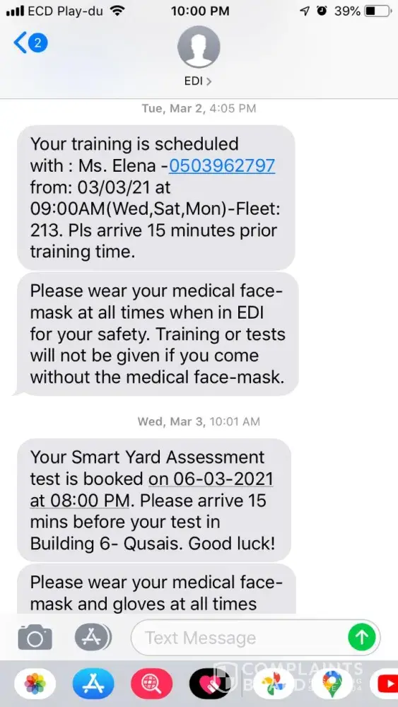 As we contacted EDI customer care to arrange the parking test, customer care scheduled 12 March 2021 and SMS at 7.45 (without showing AM or PM) received on 9 March 2021. During the above call customer care representative stated to attend a parking test at 7.45pm. When we reached as per schedule, EDI head office (Al Qusais) was closed, and we made the complaint on 13 March 2021 as above mentioned.