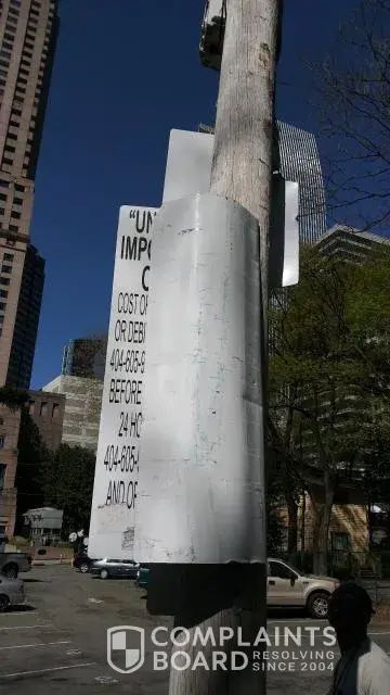 In 2008 the city of Atlanta mandated booting companies to have a clear 2.5x3 foot sign along with other compliances which was not the case in the lot I parked in. The sign was bent in half and unreadable. I have attached a photo. I have spent months repeatedly calling to request a refund and asking for an explanation on their end as to how they could have legally booted me when they were clearly not in complaince with the mandate. I can not actually get a hold of anyone to talk to and noone will call me back.