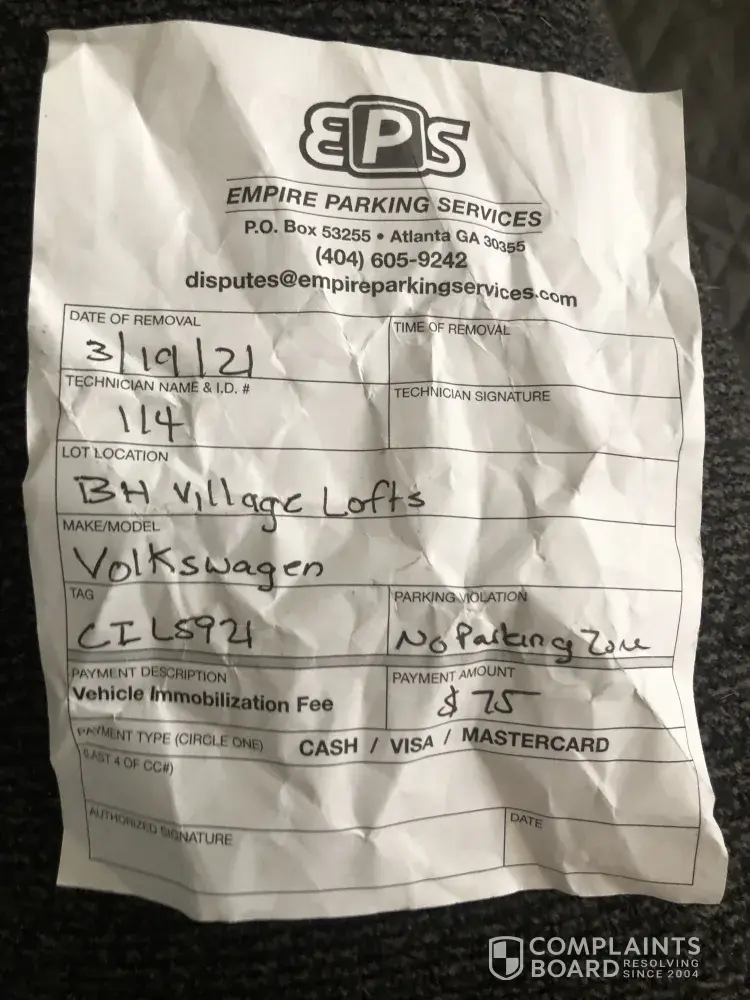 I was illegally booted in a parking lot off of Crescent Ave in Midtown Atlanta on March 21. I was working and had no choice at the time but to pay for the boot removal in order not to be stranded later that night when trying to go home. I started trying to dispute with the company 2 days later- company pretends to have a dispute form on their website which only directs you to a third party answering service that takes down your info. If you're lucky enough to get a return call but miss it- you are screwed and only left with the same third party phone number in which you will call over and over and nobody will ever call you back again.