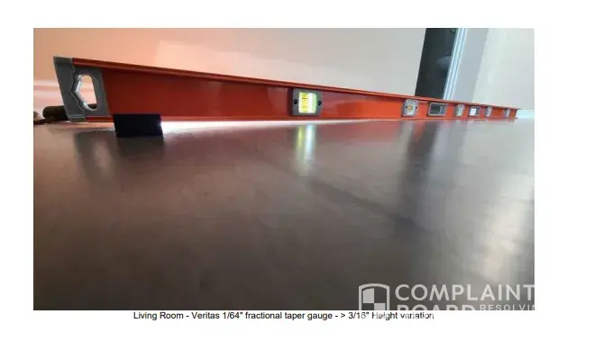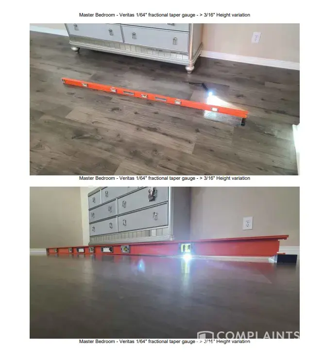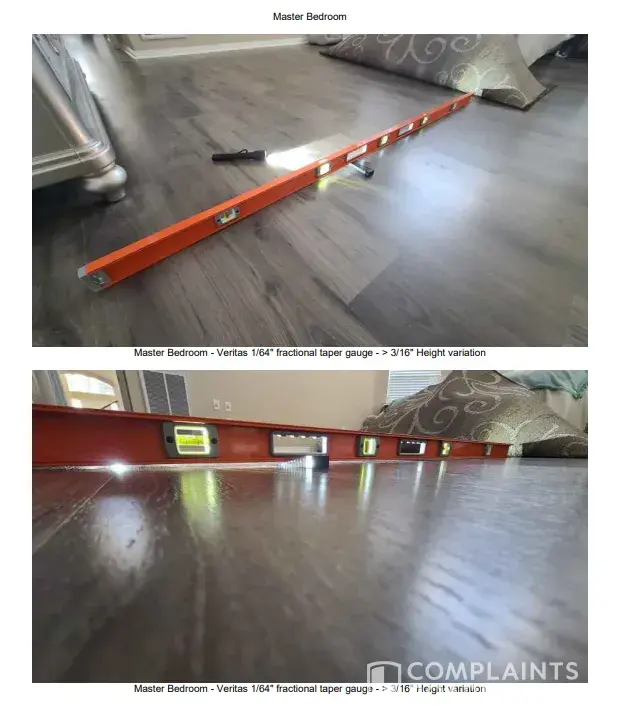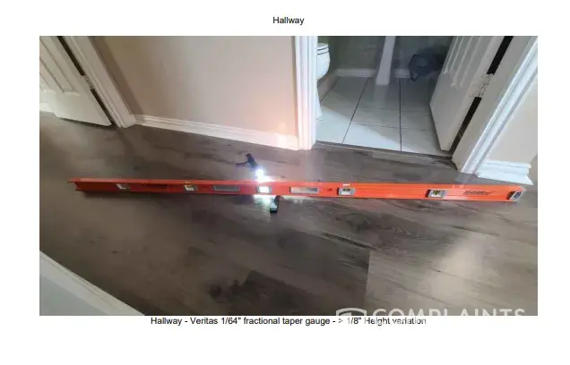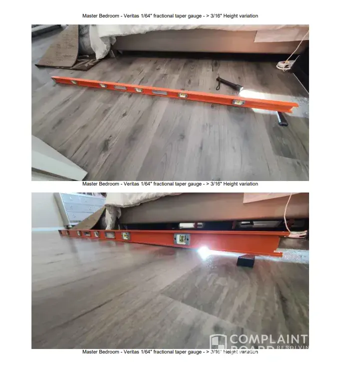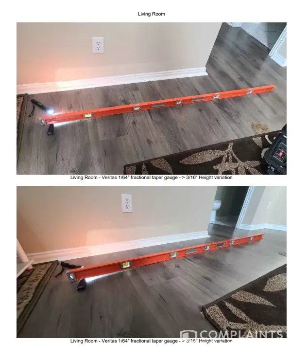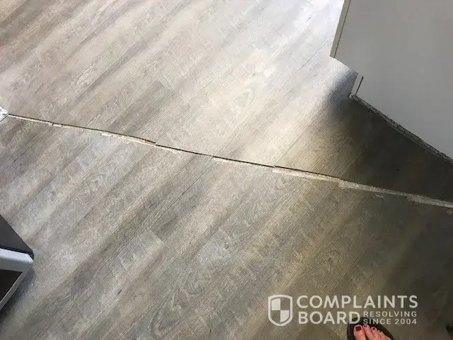 Desired outcome: Desired resolution: we want the floor to be laced into a seamless install from the living room to kitchen and bath (as originally asked). We also want the quarter round in each room to match (white not wood) and be mitered properly.