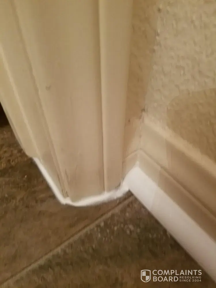 While my vinyl floor was being installed I did not like the white quarter round and white caulking that was all over the vinyl floor and asked him why there was so much caulking. He said that's what they told him to use. I wanted him to stop but he said that he had to install it and that I could complain later. I was told by the salesman that only a bead of caulking would be used near the tub areas. I installed vinyl in 2 bathrooms. There was white caulking everywhere. I will attached photos. After the installer left I called Empire Today and complained. I also requested that they do not send the original installer again. If he thought he did a good job then what would he do again. I have had crews out 4 times to resolve the issue of unprofessional installation, damage to wall from the toilet being returned to original position, glue on the wall and doors, tiles that were banged and fell off and damage to baseboards during installation. This is damage that cannot be repaired by unprofessional installation. Not only was there damage to the baseboards on the original installation it is even more damaged after it was fixed by the original contractor. This is the same person I requested not to return. I believe that the company Empire Today hires must be responsible to fix the damage. This must be their rule or part of the contract. I am requesting a large reduction in my original contract, which is 15 pages long. The offer in reduction from Empire Today will not pay for the estimates I have received to repair the baseboards and wall. I am posting the before and after photos. Customer relations has been very helpful in trying to resolve the problem but you cannot fix the damage without replacing the baseboards, which Empire Today is not willing to do. I