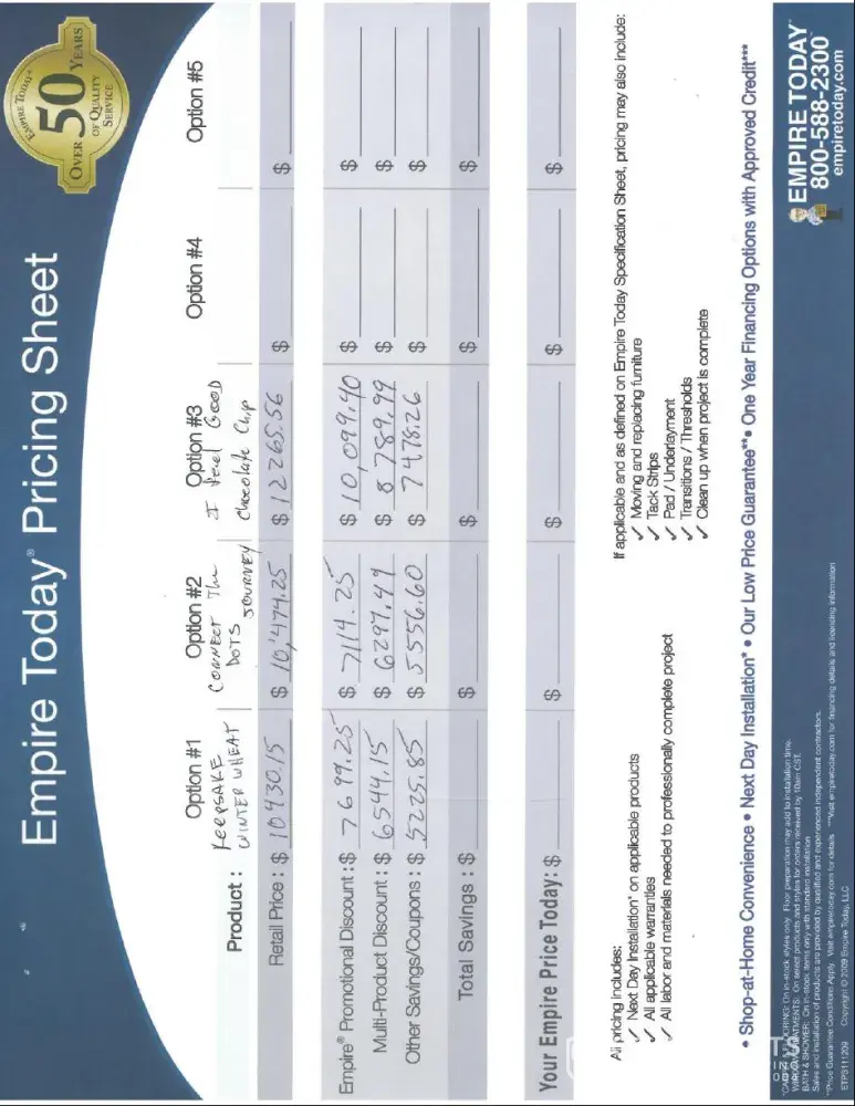 We selected a few colors and then came the pricing. Keep this in mind before I give you the figures. I have already contacted Home Depot and Lowes and received quotes from both for around $2, 000 to do the whole house. The first three prices he gave me were the retail prices for the carpet. The three we selected came out as followed; $10, 430.15, $10, 474.25 (Option 2) & $12, 265.56 for (Option 3). Then he goes on to say that Empire is running this HUGE promotional sale where you pay full price for the carpet installed in the two largest rooms in your house and the rest are free... you only pay for labor on the rest. So he flips out his calculator and pretends to crunch numbers for a few minutes. He then gives us the "TODAY ONLY" discount price of $7, 699.25, $7114.25, & $10, 099.40. I clearly had a shocked and surprised look on my face. When I started to question the price he quickly stopped me and said that he thinks he can get me an even better "BULK" price for the carpet because I needed so much of it. So, he whips out his cell phone to call his supervisor to try and "negotiate" a better bulk price for me. Somehow almost immediately, he had someone on the phone "negotiating". It really sounded like he was talking to himself... but, if he was talking to a "supervisor" it was clearly playing the bad cop good cop role of con sales. He sheepishly smiled and said, "wow that's a great deal" he then turned to me and gave me $6544.15, $6297.49, & $8789.99. WOW! I thought... GREAT DEAL!?!? not. I obviously grew more irritated. All the while he is trying to force me to sign a contract with him...especially to keep the prices... I had to sign immediately. Since when would anyone in their right mind sign a contract to by material from someone? These people are really stupid! So, then the guy says if I pay cash for it I would get yet another discount. Again this ### whips out his cell phone and calls "the powers that be"... yet again the person on the other end of the line answered within seconds. And again Adrian Gackle seemed to be talking to himself again. This time when he hangs up he comes at me with these prices $5225.85, $5556.60 & $7478.26. He tells me again that the only way I will get these prices is to sign a contract that day.