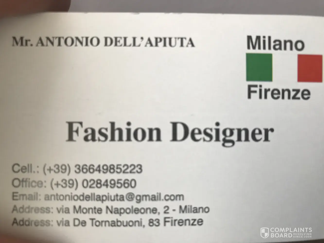 Sorry, for some reason the pic of his card isnt uploading. Its got the name "Mr. Antonio Dell Algida", he claims to be a designer for Armani, email is "antoniodellalgida@emporioarmani.com". Address "VIA. MONTE, NAPOLEONE. 10, MILANO" Mobile "+[protected]" Fax " +[protected]"