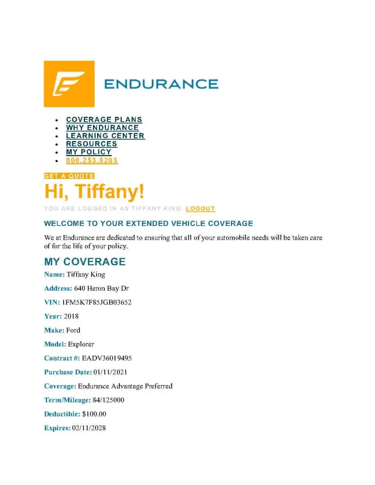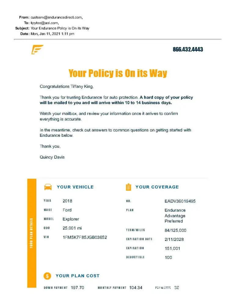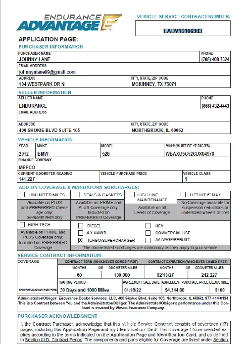 Endurance Vehicle Service Contract #CDY2001713