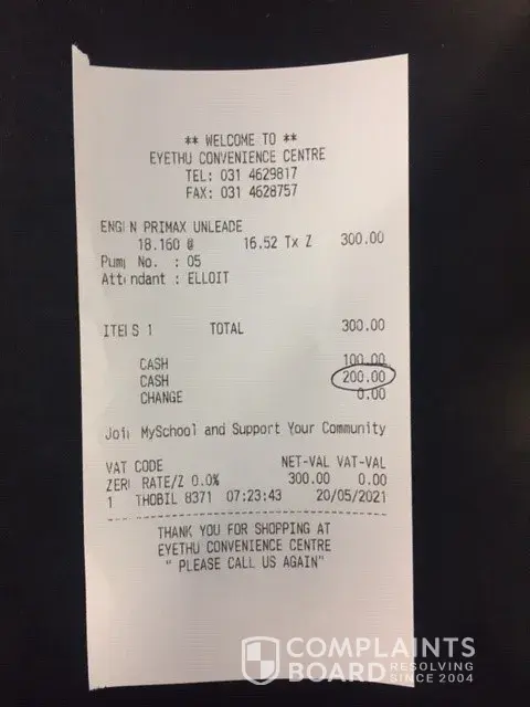 On the 19/05/2021 at 7:20 I went to one of your service station for petrol refeil