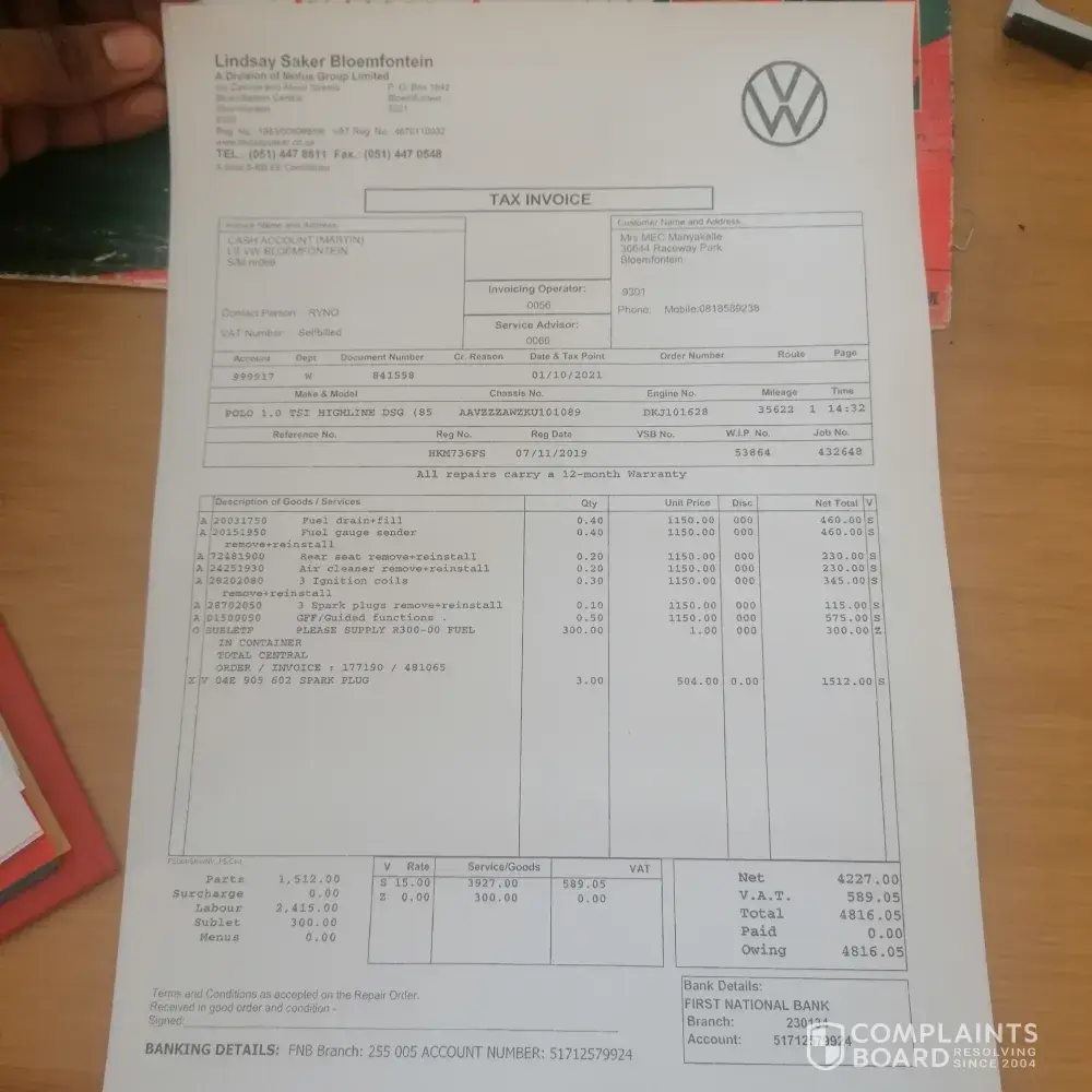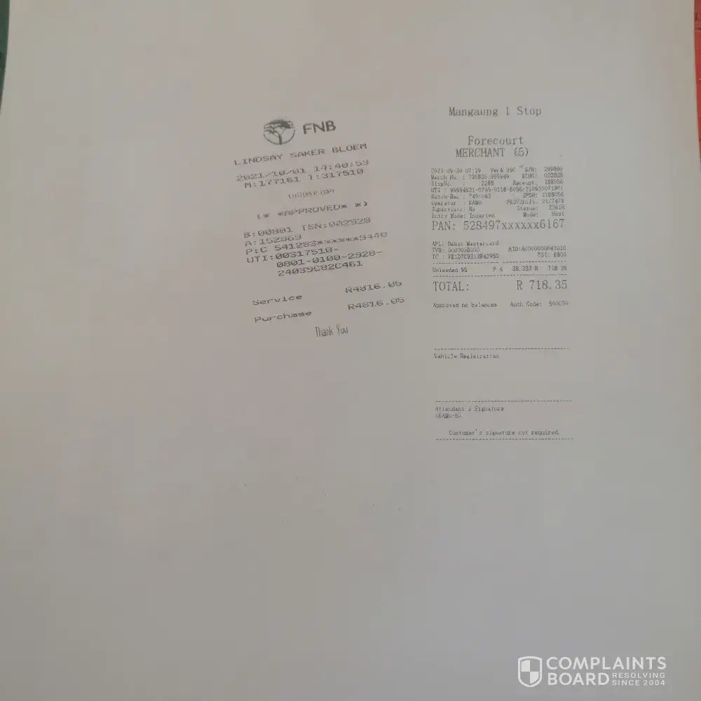 On the 30th September 2021 i filled the petrol from Engen in Bloemfontein next to Aljos spar, after i left the garage the car started to give me problem. The engine warning light was on, i took the car to VW they discovered that the car is having dirty fuel. I had to pay R 4 816.05. Because the Engen manager refused to take responsibility.