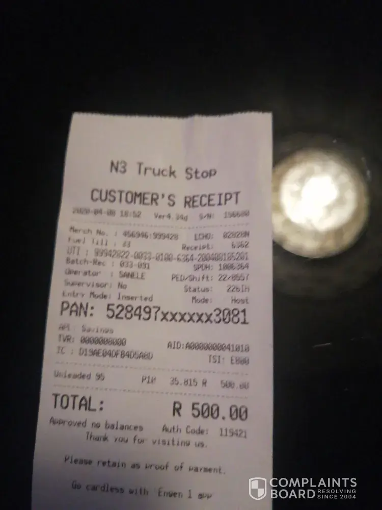 I was then told to go withdraw money at the only ATM that you guys have on your little garage which is Nedbank and I am using ABSA...I refused because Absa will charge me morethan R100.00 for a saswitch. A guy call Emanuel Mbele who claimed to be the assistance supervisor was also useless and acted like I was the one at fault or as if I am the one who caused the problem. I was forced to drive to A Total garage with one Engen petrol attendance which made me and my girlfriend very uncomfortable.. we didn't even know the place. The guys could have hijacked us with ease. I felt so powerless and my was only advised to pay R450.00 meaning R50.00 was for petrol which I feel like it was a slap on my face.