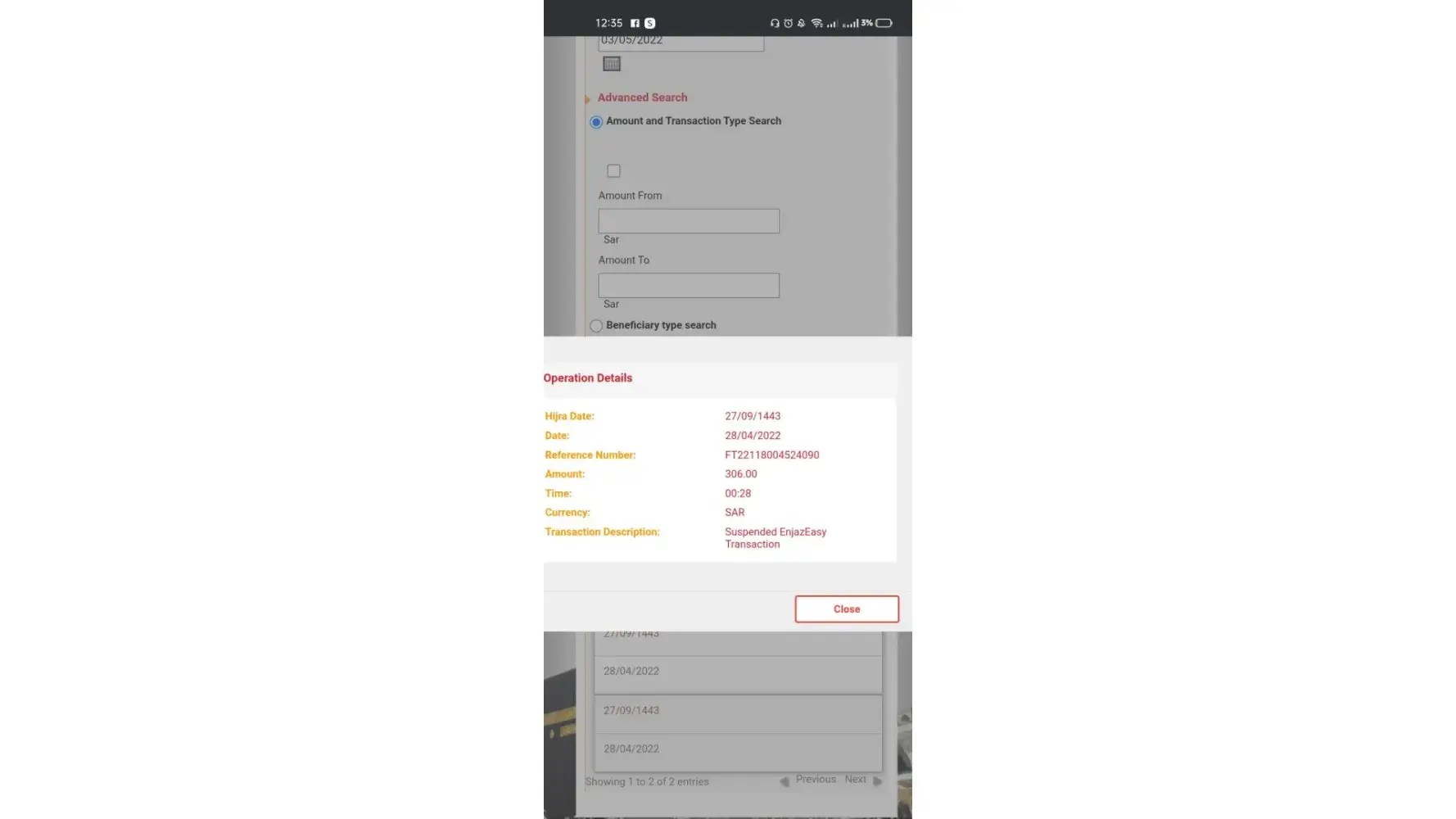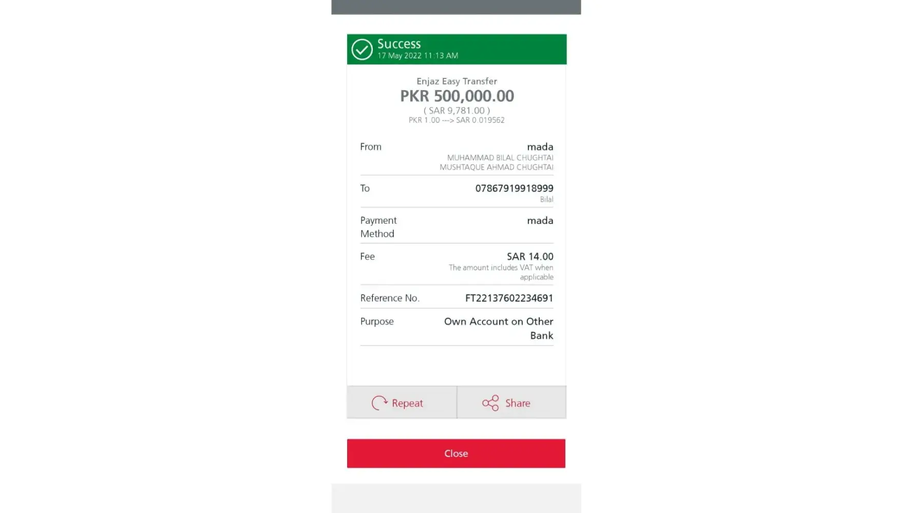 I have made a transfer through Enjaz mobile app ref. FT22137602234691 at 11:13 AM today 17 May, 2022 but it is not yet transferred to the account.