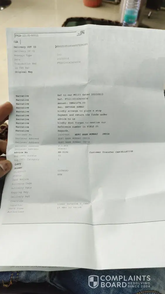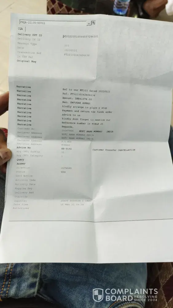 Failure of money transfer through swift