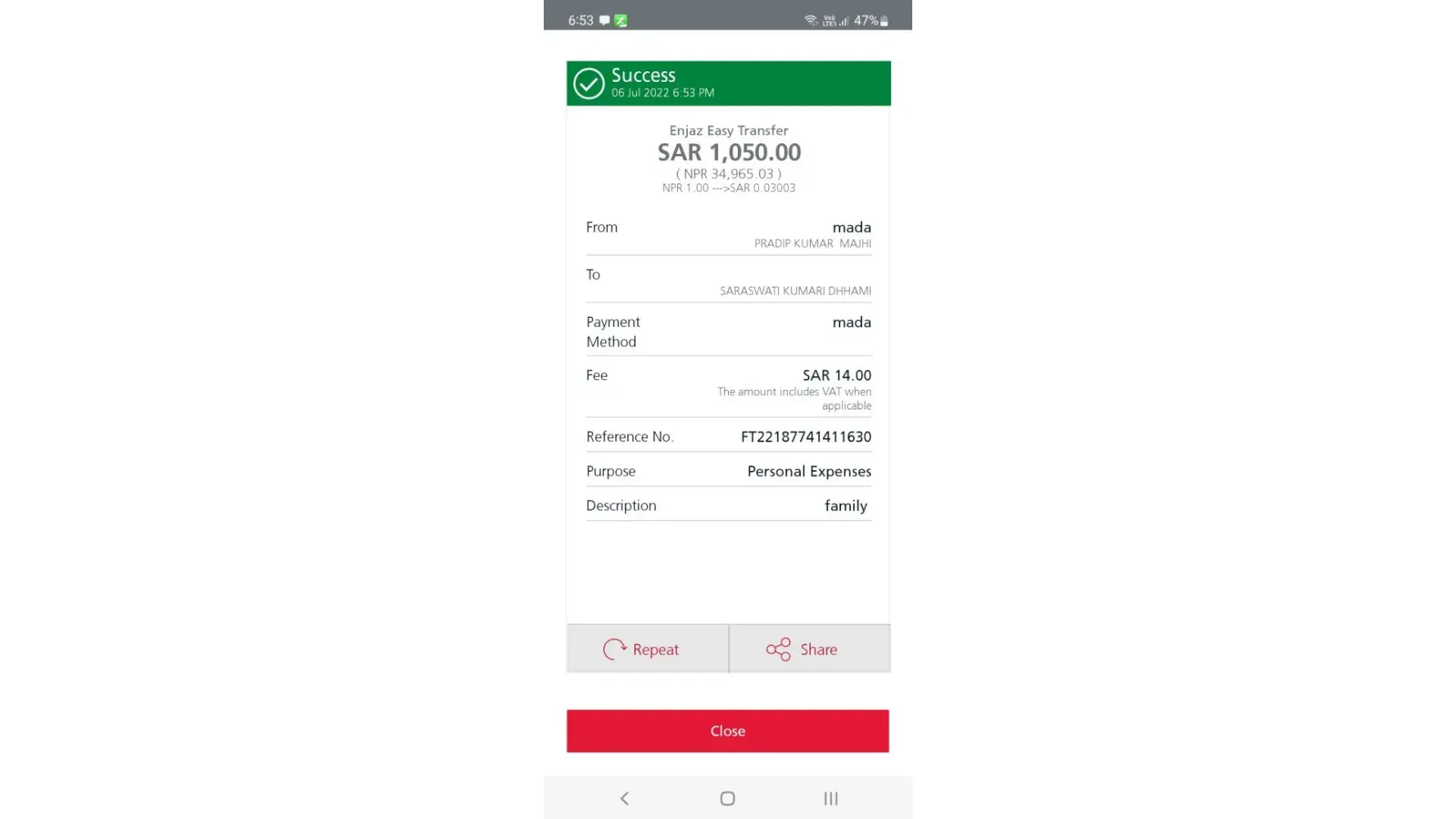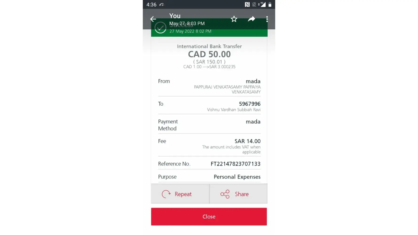 I have Made Swift transfer 50 CAD through enjaz on-line on 27th May 2022 from Saudi Arabia to Canada, but not reached the beneficiary till now. My transaction reference Number given below.