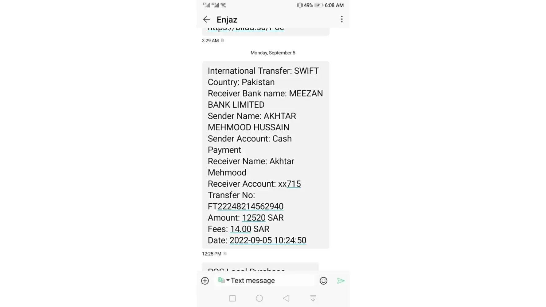 On September 5, I transferred the money to my personal account in Pakistan, which is in Meezan bank. But the money has not been received yet, today is 12th September.