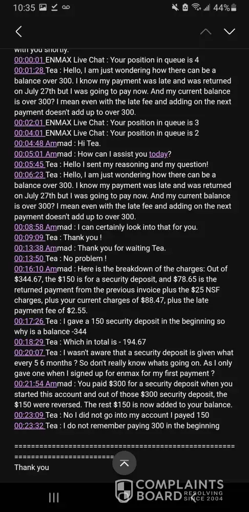 My name is Tea Zagorac and I started an online chat with Ammad due to the overcharge on my Enmax bill. As I tried to explain my situation the agent ignored what I have said and ended up disconnecting from the chat still making me pay the overcharge which was over 300$ and my bill was only 80$. There was no implication where I showed aggression nor violence and I have a transcript receipt to prove the entire conversation.