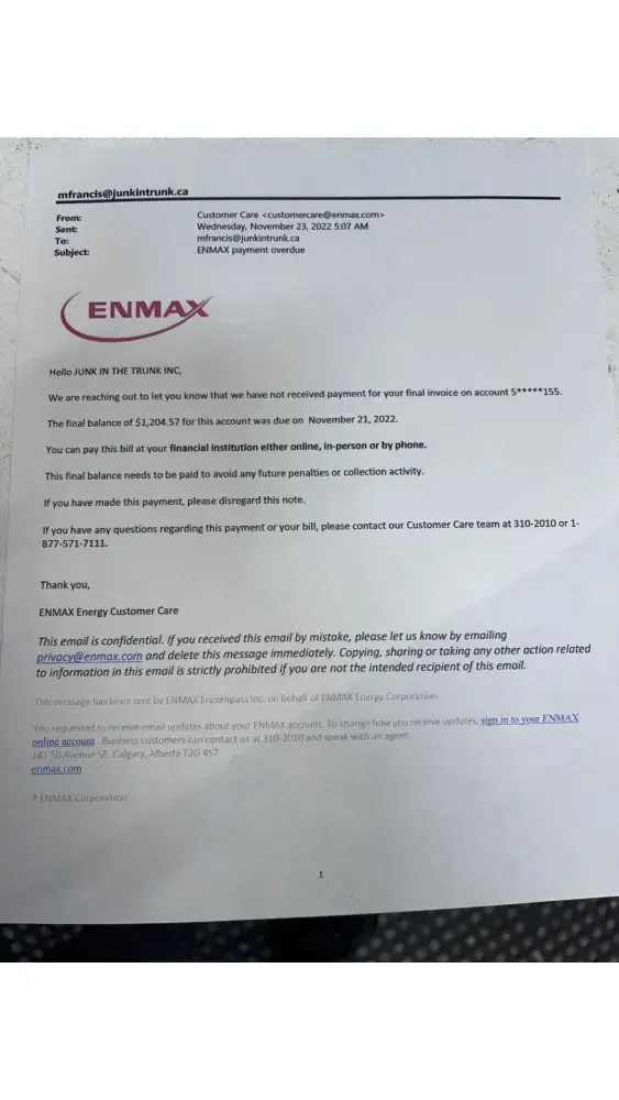 I was moving out of my sister rental, the new tenants stated they will do the ENMAX transfer and they did I received the notification a month later ENMAX said stated that even though
