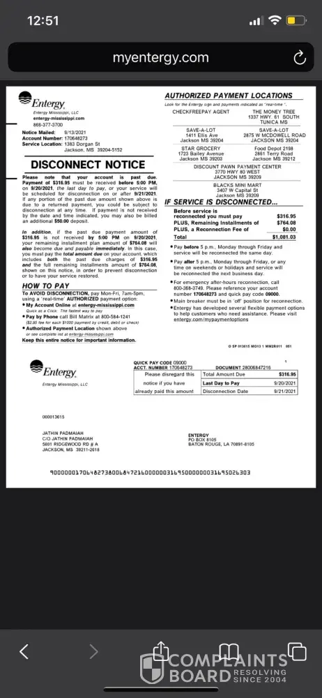 I just paid a $325 light bill then yall cut my power off I had to use a check to get them back on now you 11hundred dollars. I have 3 kids her ages 2, 4, and 7 and thats just a dam shame.0i work from home and they cut my dam power off in the middle of a call. Temperature dropping, the virus is rising y'all dont have any compassion and as much money I done spent on lights how the hell I owe you that dam much. I gave you what you said I owed and you come up with this ridiculous [censored] amount. Then I am due for cut off on In a day that is outrageous. My address is 3120 Ponderosa Dr Jackson MS 39212. Account #: [protected] is overdue.