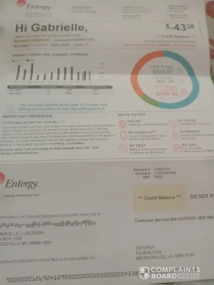 ll mam did u call back to discuss the payment arrangements after paying the bill I said then she tells me ok the agent u spoke forgot to set the payments toward ur bill I just fell like something needs to be done because if they not doing they job and u did ur part by paying the bill and calling to set it up so I could be in the clear and then to be told mam my supervisor is going to tell u the same thing u have to pay the 399.46 just because Entergy employee didn't do their job I talk with the agent on Nov 1 at 3:43MY QUESTION IS HOW MANY PEOPLE ARE GETTING RIPPED OFF AMD JUST TOLD JUST PAY THE BILL ...TODAY IM DOING THIS CLAIM WHILE WAITING ON HOLD FOR A SUPERVISOR SOMETHING NEEDS TO BE DONE HARD AS TIMES IS ENTERGY IS JUST TAKING PEOPLE MONEY