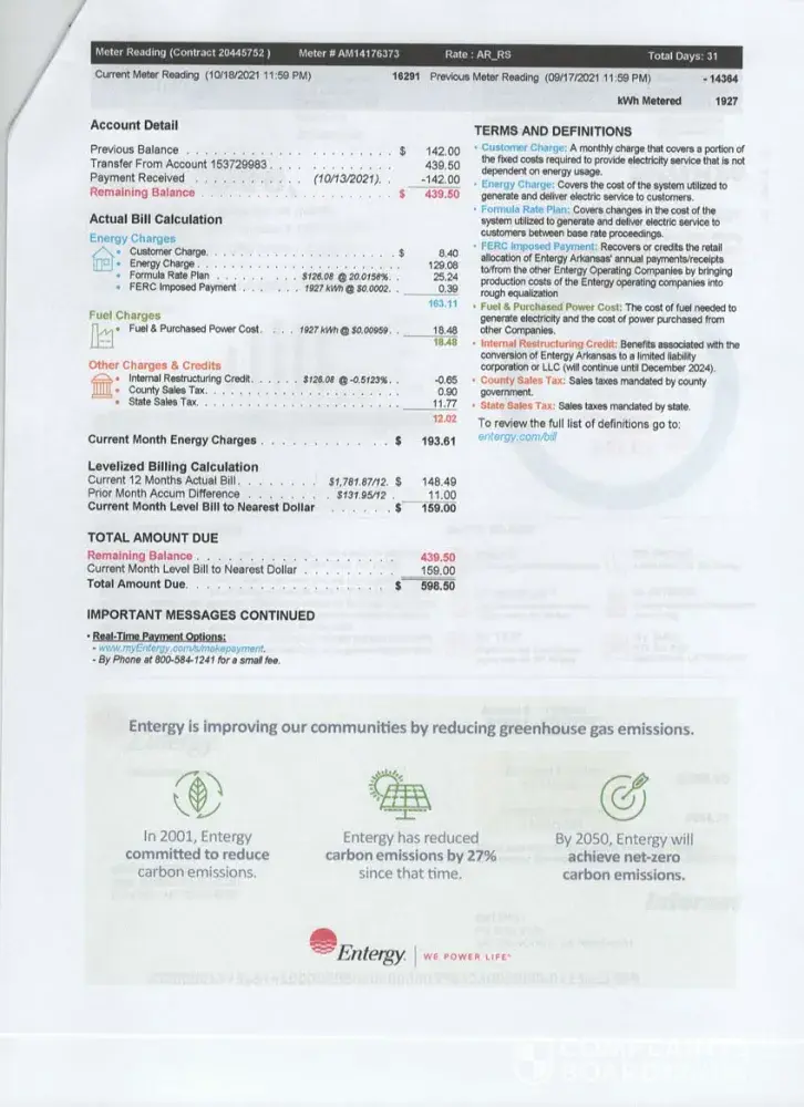 On my October/2021 bill, (Invoice # [protected]) I had an unusual "addition" to my bill. It stated "Transfer from Account # [protected]" in the amount of $439.50. I knew that my bill seemed awfully high, so I checked my records for any old accounts to make sure that the account listed was not an old account from the past, even though I knew that I had never "not paid" an electric bill. I had to call Entergy on multiple occasions over the next several days to get the help I needed and finally get some answers to these unauthorized charges that someone from Entergy added to my bill. The gentleman that helped me actually looked up the account number, listed above, and told me the address associated with the account. I had never lived at that address, nor did I know anyone who ever lived there. It was a Little Rock, AR address in the name of Kendall Pinkney. I do not know this person except I did recognize that name. That is who I purchased my home from this past May. Like I said, I do not know this person, but I was told that he and his family moved to TX.