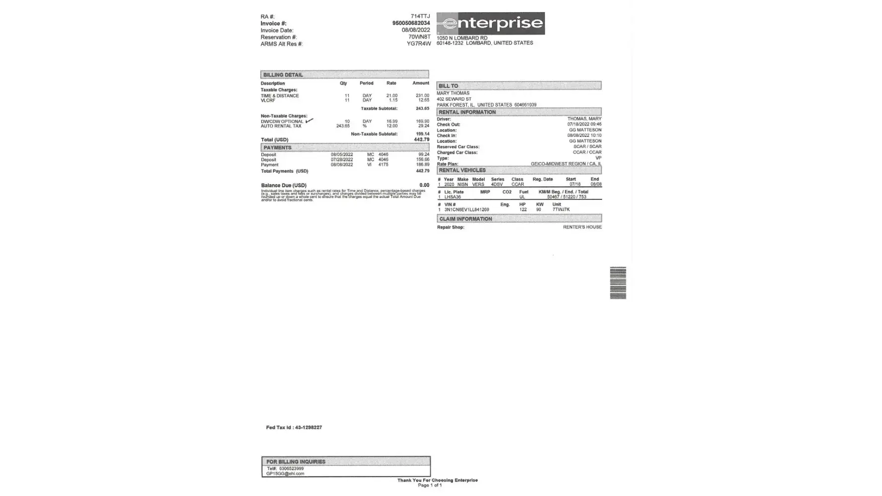 I had an accident back on August 7, 2022, and I am currently in my second rental vehicle from the Enterprise Car Rental location on 159th Street in Orland Park, Illinois.