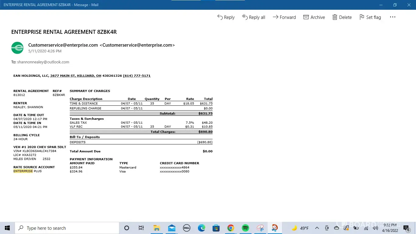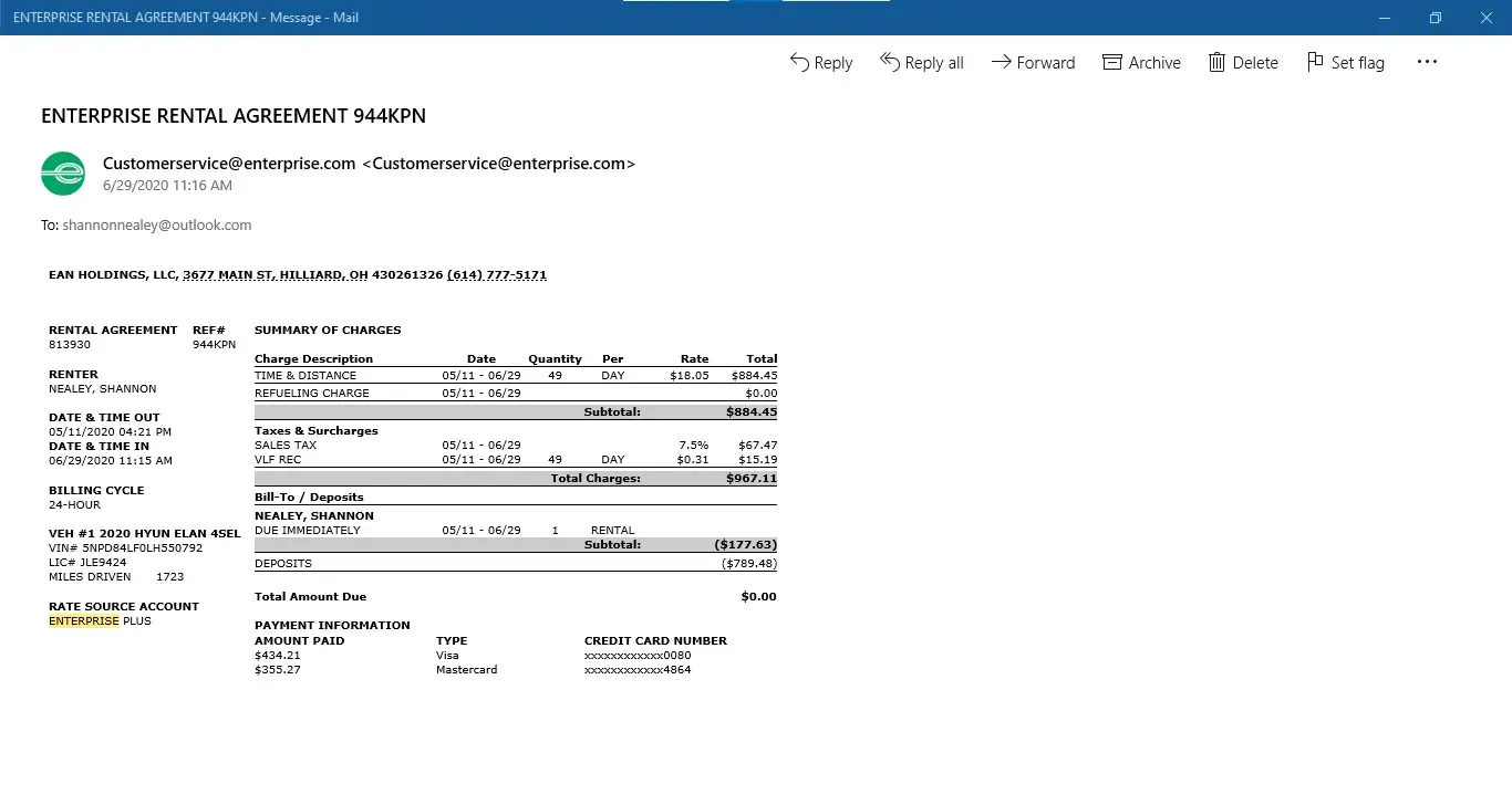 So I made arrangements with work and after working 16 hours, I made the two hour trip back to Columbus and dropped off the rental at midnight on June 29, 2020. I retrieved my personal vehicle and made the two hour trip back to work in time to take a nap and go back on duty. I went into the app on my phone and locked my card so Enterprise could no longer charge my card, since I dropped it off. They still charged me after the rental was returned and then claimed they started the paperwork to report the car stolen and then I was placed on the Do Not Rent list.