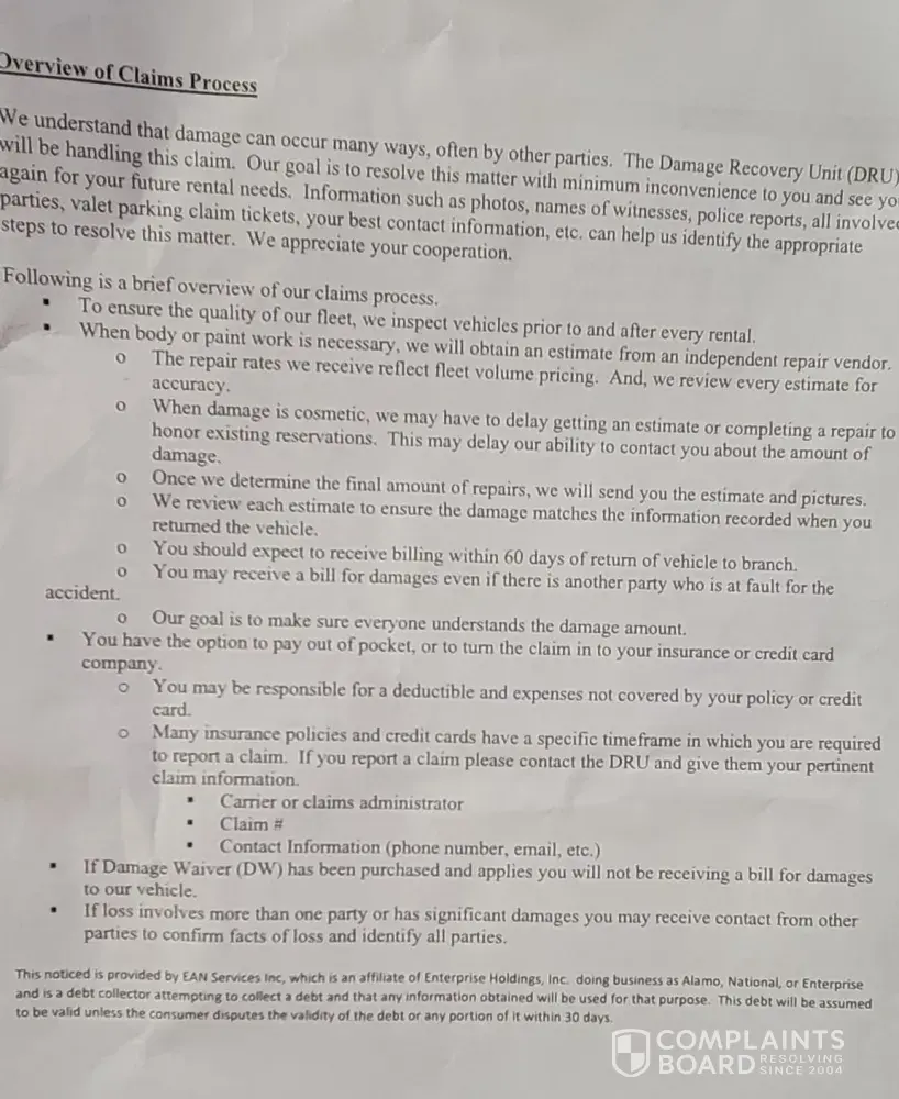 On November 23, 2021, I rented a vehicle from your Middletown, NY location before leaving I made the rep aware of cosmetic damage to the rear of the vehicle a note was made by the rep. On November 26, 2021, I returned the vehicle to your Vestal location with a full tank of gas and the only damage was the cosmetic damage that I made aware to the rep in Middletown, NY before I left the Enterprise lot. Today I get a FedEx letter with only two pages in it I have added them below. I had to search to find the company name that sent it and found it in the small print of the 2nd page. There is no address to send the incident report form that wasn't either there back to the company in small print. There is no phone number to contact these people either. So, can you explain to me how I am to dispute this within 30 days? They sent nothing, not the vehicle or what is damaged, so I can at least send them a proper dispute. And I will be disputing this because I caused no damage to that vehicle. I have never run across such an unprofessional company and am amazed Enterprise allows this shady incomplete and ridiculous attempt of looking for a quick buck. I have always trusted Enterprise but will now think twice before even looking towards your rental counter. Rental agreement #50KPQQ.